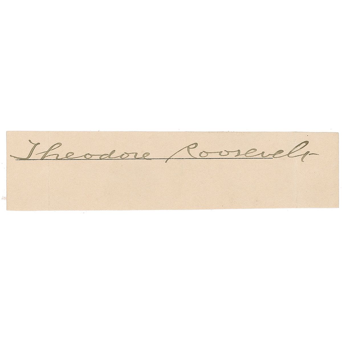 Marvelous ink signature, “Theodore Roosevelt,” on an off-white 5.5 x 1.25 clipped slip. In fine condition, with two vertical creases, one passing through the “h” in Theodore, and the other passing through the “l” in Roosevelt. Accompanied by a signature of his vice president, Charles W. Fairbanks.