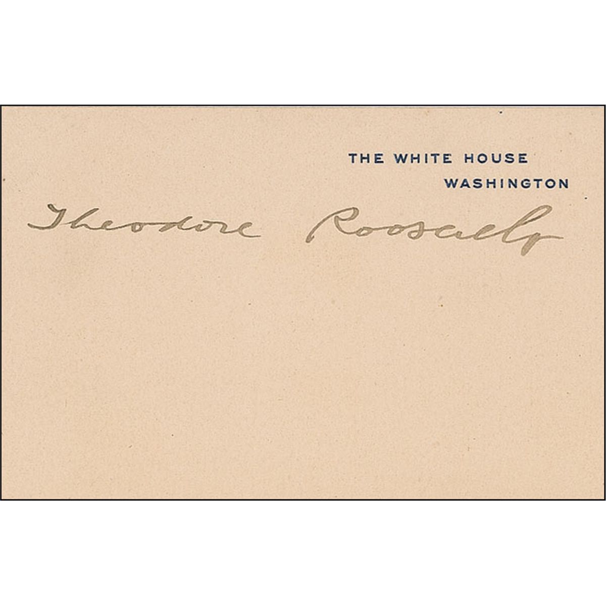 Signed White House card, neatly signed in fountain pen, “Theodore Roosevelt.” A uniform shade of toning and mounting remnants on reverse, otherwise fine condition.