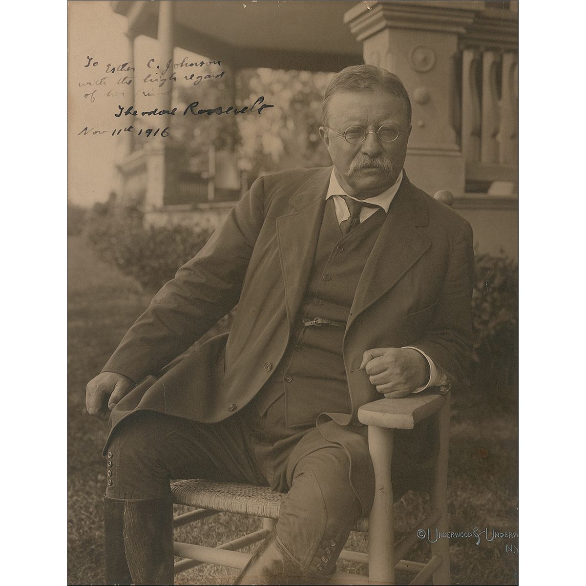 Vintage matte-finish 10.25 x 13.5 Underwood and Underwood photo of Roosevelt clad in a three-piece suit and his riding boots, sitting in his yard at Sagamore Hill, signed and inscribed in fountain pen “To Esther C. Johnson with the high regard of her friend, Theodore Roosevelt, Nov. 11th 1916.” Inscription light but legible due to decreased ink flow, trimmed edges, a few light surface creases, and a few hints of trivial silvering, otherwise fine condition. An outstanding portrait of TR, displaying grim determination in his post-presidency.