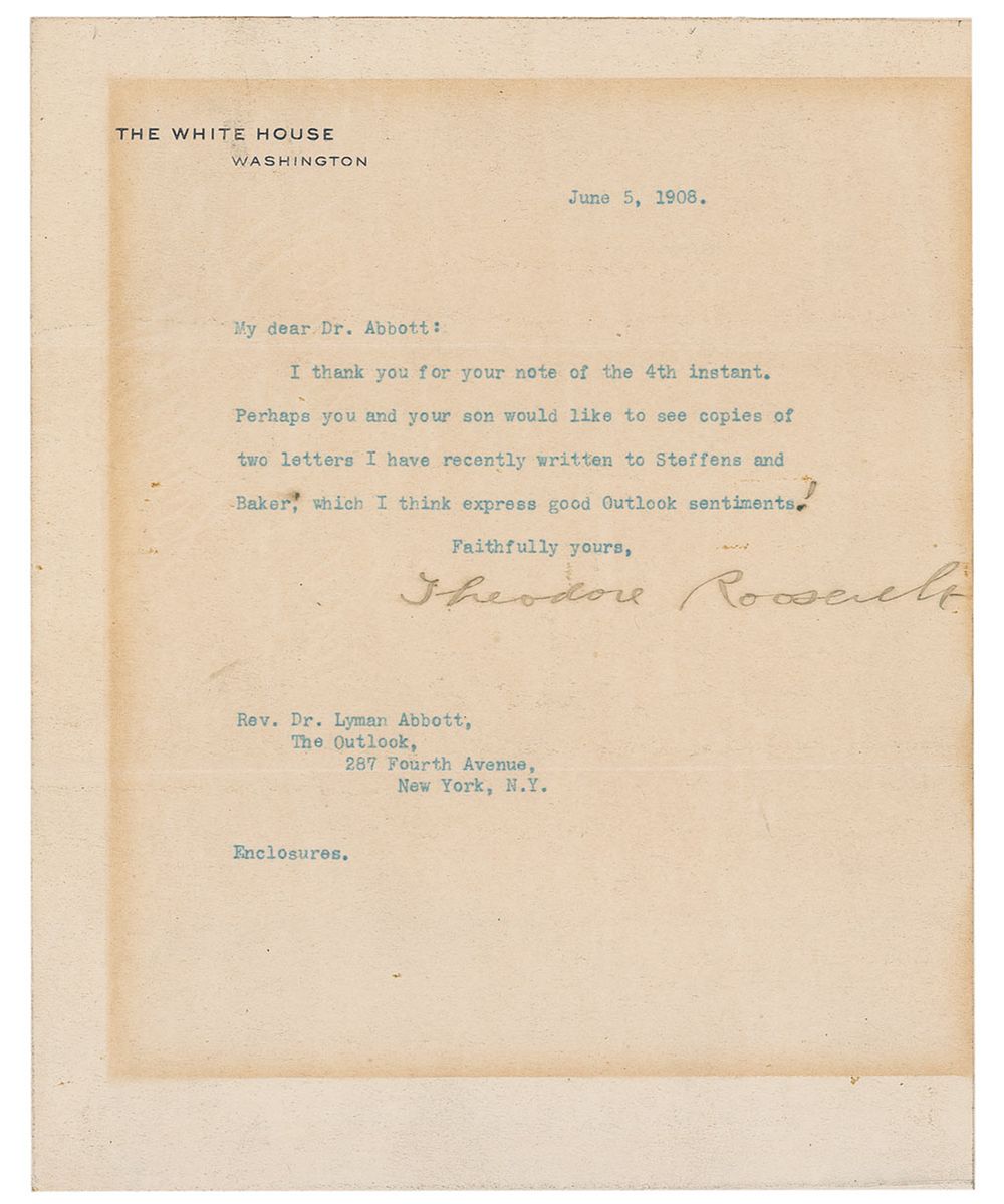 TLS as president, one page, 7 x 9, White House letterhead, June 5, 1908. Roosevelt writes to Rev. Dr. Lyman Abbott, in full: “I thank you for your note of the 4th instant. Perhaps you and your son would like to see copies of two letters I have recently written to Steffens and Baker, which I think express good Outlook sentiments,” adding an exclamation point in ink. In very good condition, with a uniform block of toning from previous display, some light rubbing, and a few trivial stray marks.