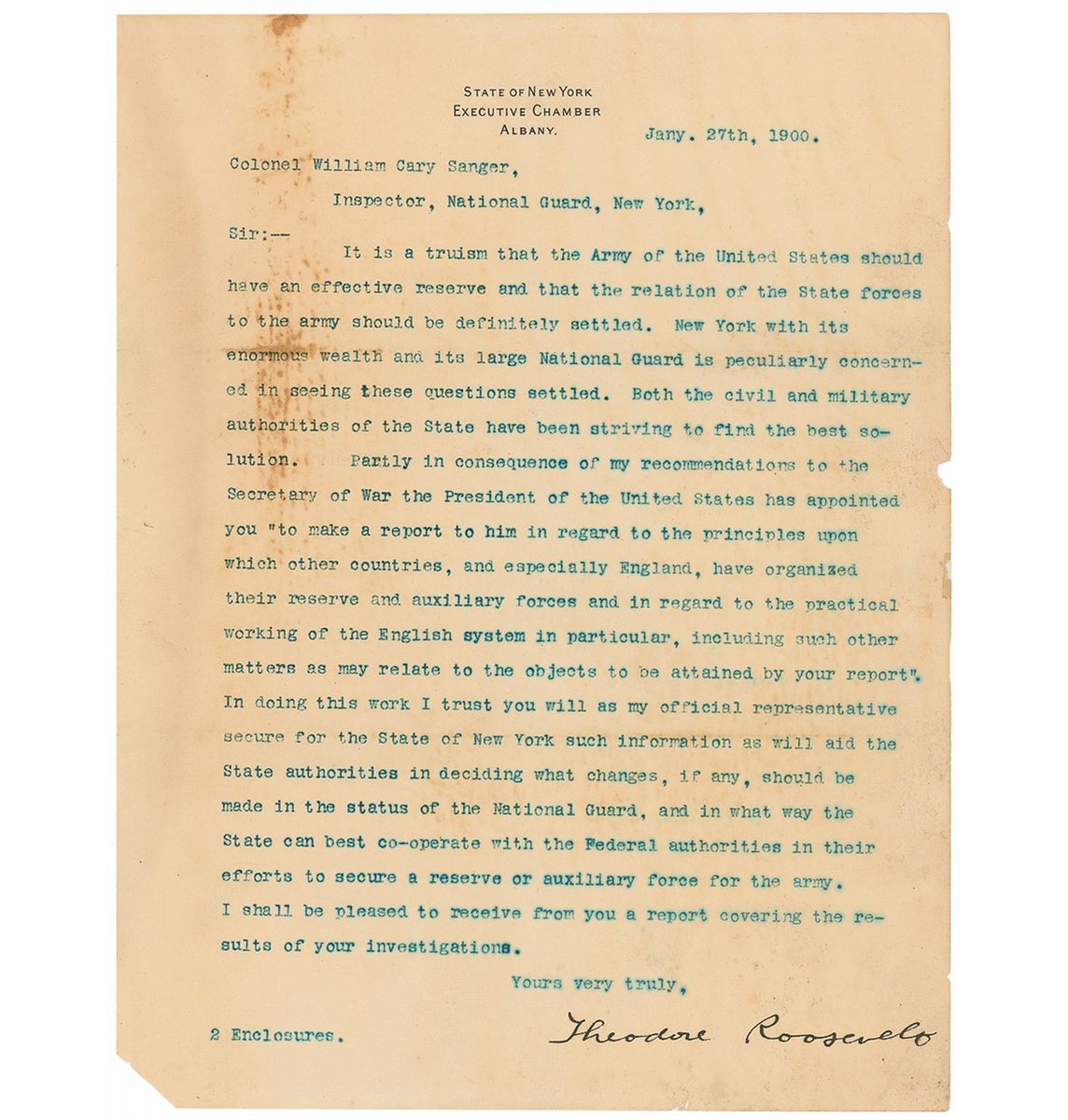 TLS, one page, 8 x 10.5, State of New York, Executive Mansion letterhead, January 27, 1900. Letter to Colonel William Cary Sanger, Inspector of the National Guard. In full: “It is a truism that the Army of the United States should have an effective reserve and that the relation of the State forces to the army should be definitely settled. New York with its enormous wealth and its large National Guard is peculiarly concerned in seeing these questions settled. Both the civil and military authorities of the State have been striving to find the best solution. Partly in consequence of my recommendations to the Secretary of War the President of the United State has appointed you ‘to make a report to him in regard to the principles upon which other countries, and especially England, have organized their reserve and auxiliary forces and in regard to the practical working of the English system in particular, including such other matters as may relate to the objects to be attained by your report.' In doing this work I trust you will as my official representative secure for the State of New York such information as will aid the State authorities in deciding what changes, if any, should be made in the status of the National Guard, and in what way the State can best co-operate with the Federal authorities in their efforts to secure a reserve or auxiliary force for the army. I shall be pleased to receive from you a report covering the results of your investigations.” In very good condition, with scattered toning and staining, with a moderate area of speckled staining to top left, a few small tape repairs to separations on reverse, a few edge chips, and a small tear to bottom edge.