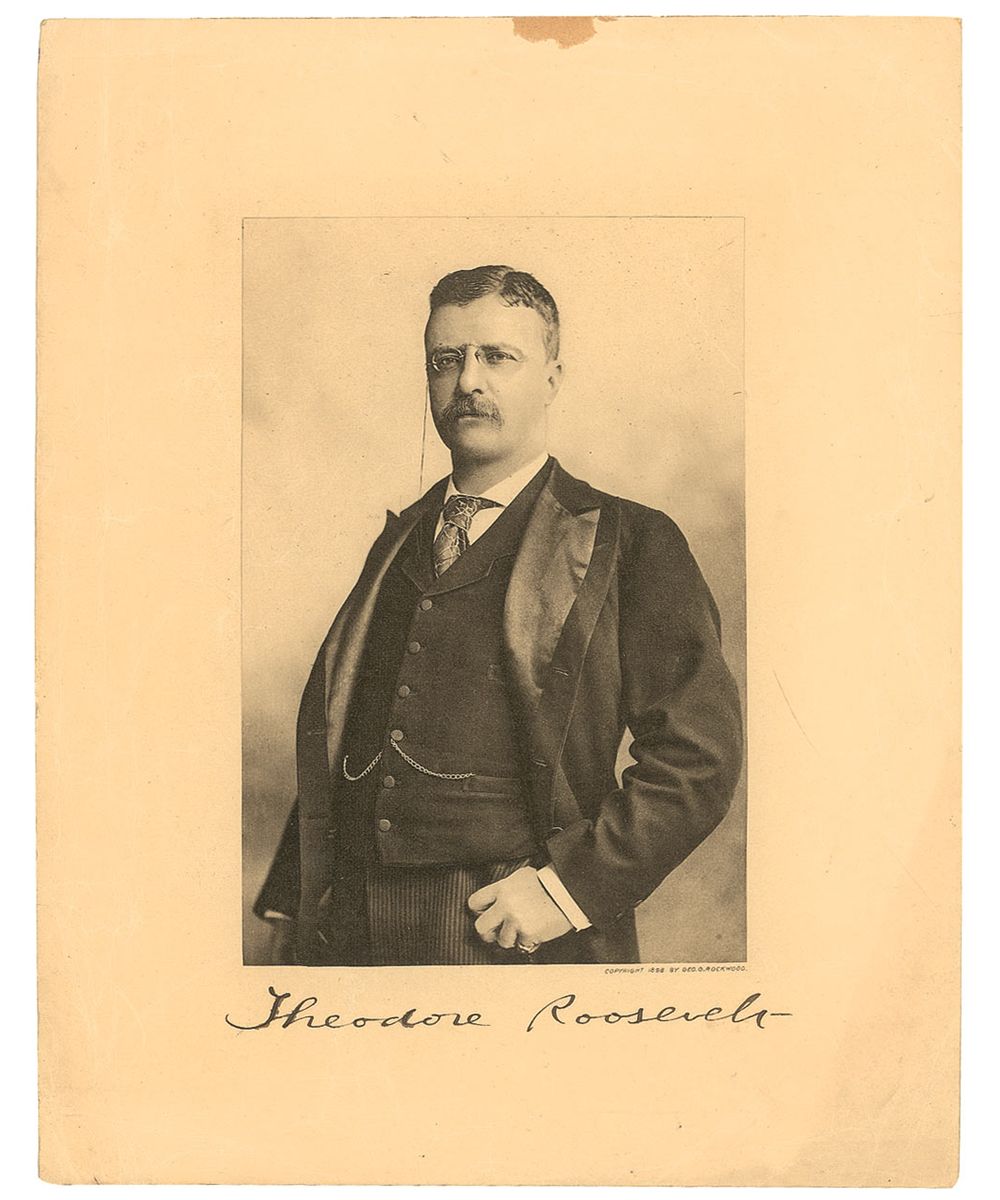 Impressive photographic print by George Rockwood, 8 x 10, signed in ink in the lower border, as president, “Theodore Roosevelt.” Notation on reverse in an unknown hand reads, “Autographed by the President, Monday, March 24, 1902.” Scattered creasing and wrinkling, mostly to borders, which could be matted out, some minor spreading of ink to a few letters of signature, mounting remnant to top edge of both sides, otherwise fine condition.