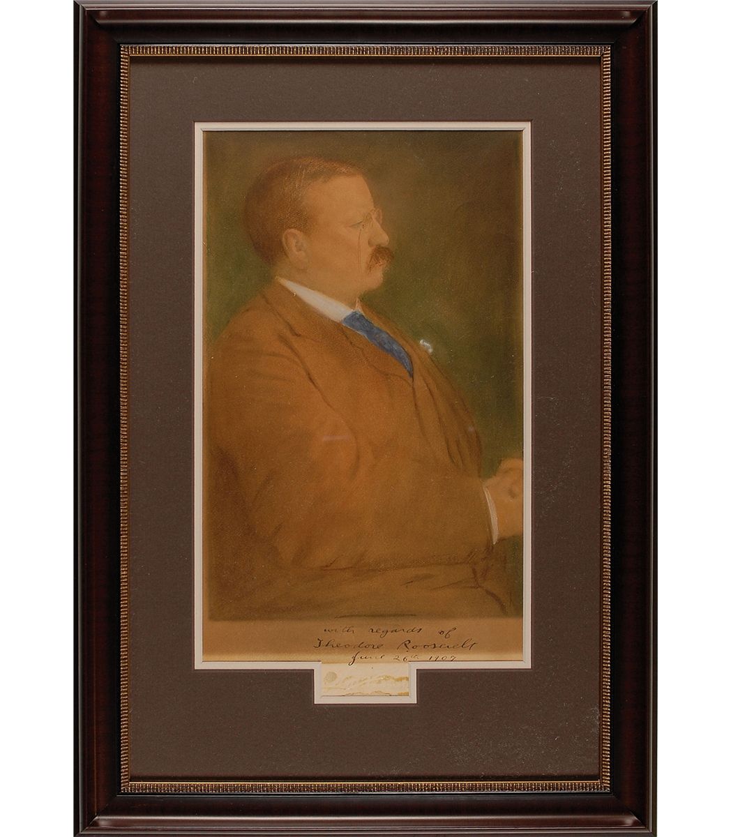 Very unusual hand-colored vintage matte-finish 8 x 14 Harris and Ewing photo of Roosevelt in profile, signed in fountain pen, as president, “With regards of Theodore Roosevelt, June 26th, 1907.” Double matted and framed to an overall size of 14.75 x 21.25. In fine condition, with a couple light creases and some light adhesive remnants to bottom border, not affecting signature. A scarce hand-colored offering, only the second one we have seen signed as president.