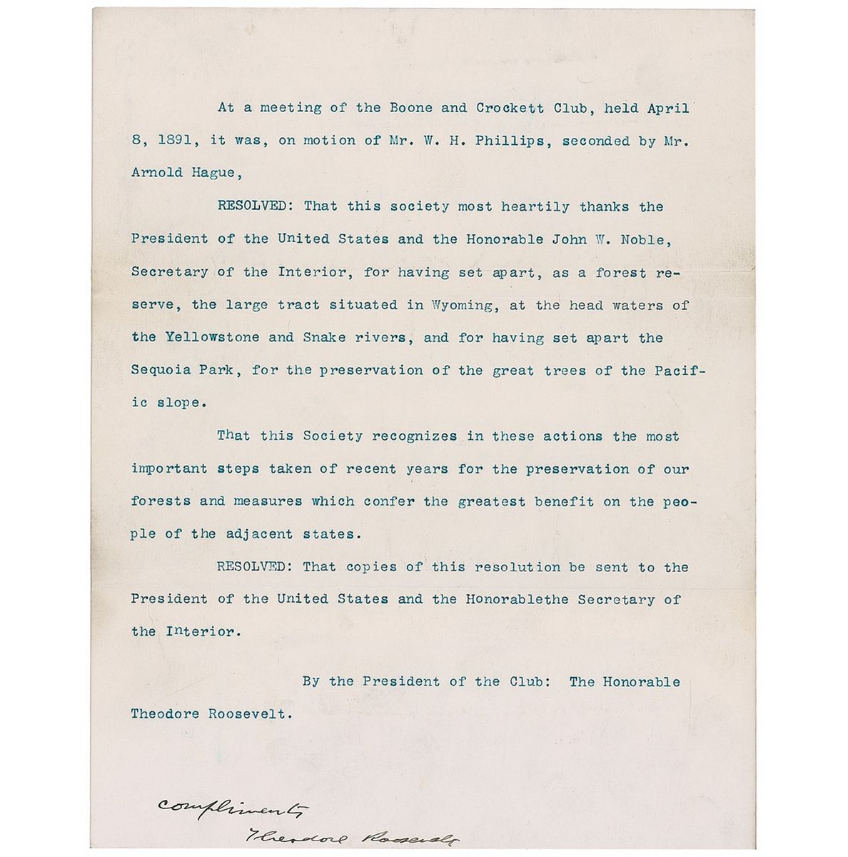 DS, signed “Compliments, Theodore Roosevelt,” one page, 7.75 x 9.75, April 8, 1891. Resolution thanking President Benjamin Harrison and Secretary of the Interior John W. Noble for establishing the Yellowstone Timberland Reserve. In full: “At a meeting of the Boone and Crockett Club, held April 8, 1891, it was, on motion of Mr. W.H. Phillips, seconded by Mr. Arnold Hague.