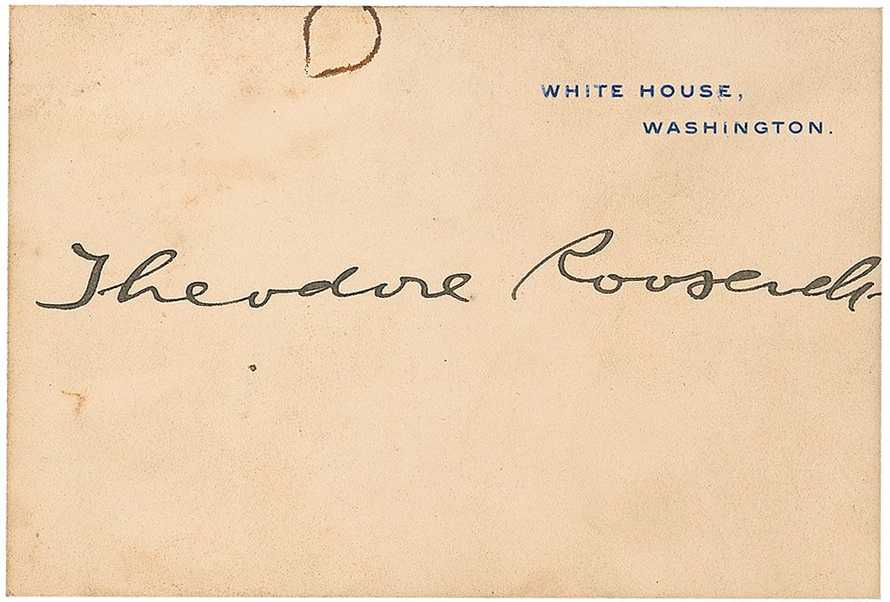 White House card, boldly signed in black ink, “Theodore Roosevelt.” In very good condition, with scattered toning and soiling, rust mark to top edge and some slight mounting remnants to reverse.