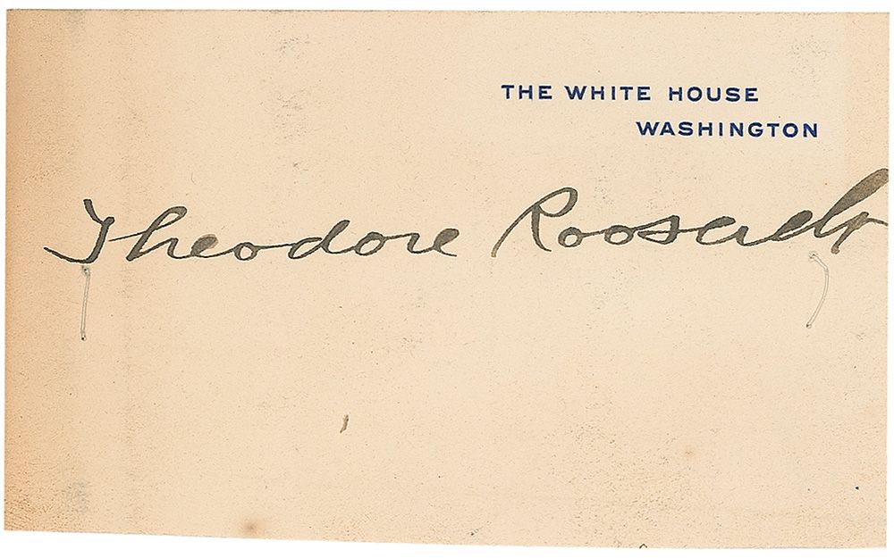White House card signed in black ink, “Theodore Roosevelt.” In very good condition, with toning to edges, some light soiling, trimmed bottom edge, and two small strings of mounting remnants passing through front of card from reverse.