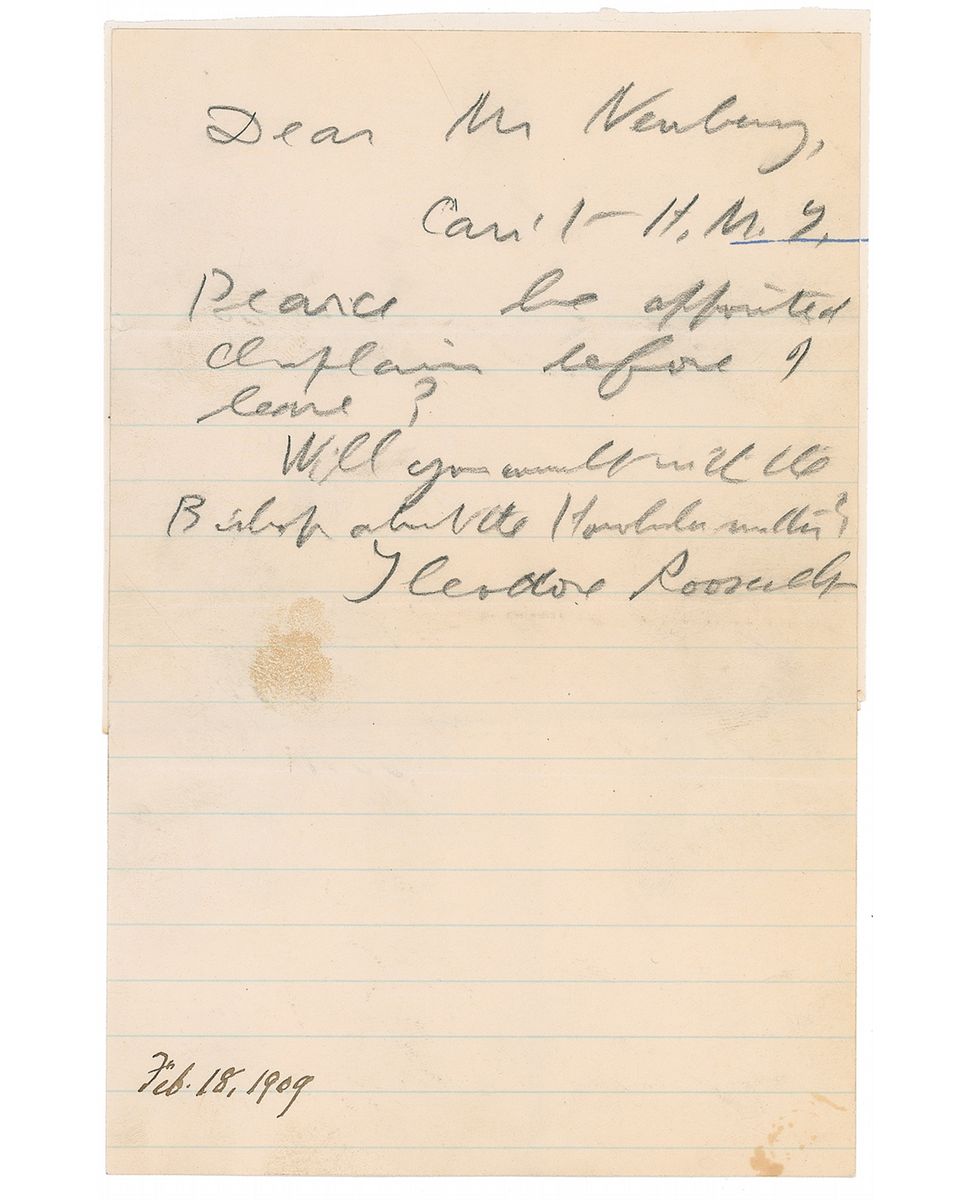 Rare ALS in pencil, as president, one page, lightly-lined, 5.25 x 8, dated in another hand February 18, 1909. Letter to Mr. Neuberg. In full: “Can't H.M.S. Pearce be appointed chaplain before I leave? Will you consult with the bishop about the Honolulu matter?” Top portion of letter is affixed to a slightly larger sheet. Accompanied by a printout of an article from the Honolulu Star-Bulletin relating to the annexation of Hawaii. Some scattered light toning and soiling, otherwise fine condition.