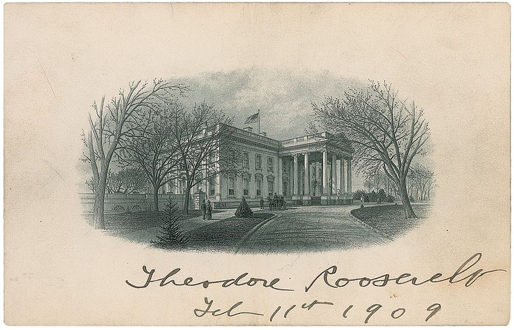 Gorgeous and detailed engraved portrait of the exterior of the White House, 6.25 x 4, signed along the bottom in black ink as president, “Theodore Roosevelt, Feb. 11th, 1909.” Some toning and soiling to the borders, otherwise fine condition.