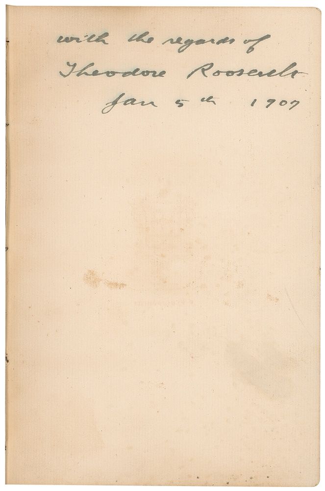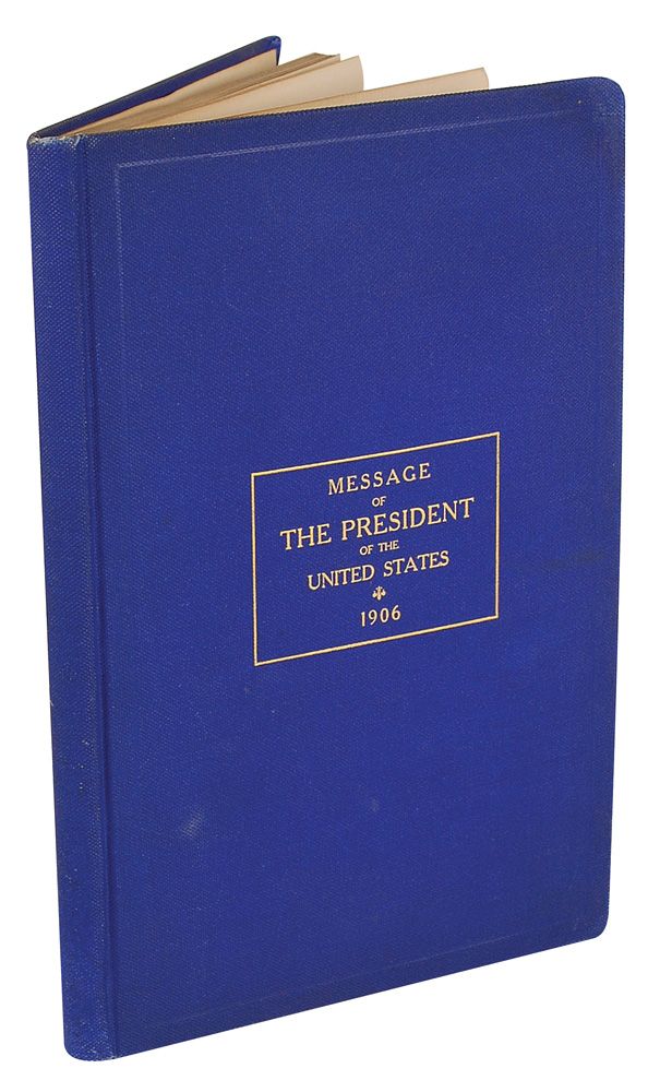 Signed book: Message of the President of the United States, 1906. Washington: Government Printing Office, 1906. Hardcover, 6.5 x 9.75, 60 pages. Signed in black ink on the first free end page as president, “With the regards of Theodore Roosevelt, Jan. 5th, 1906.” Autographic condition: slight haloing to ink and scattered toning and soiling to signed page, otherwise fine condition. Book condition: VG-/None. Royal blue cloth-covered boards with gilt title on front; edges lightly rubbed and corners bumped; mold staining to rear cover; light waterstain to feps; light foxing; previous owner’s bookplate to front pastedown; few hinges beginning to crack.