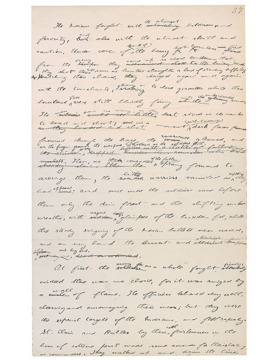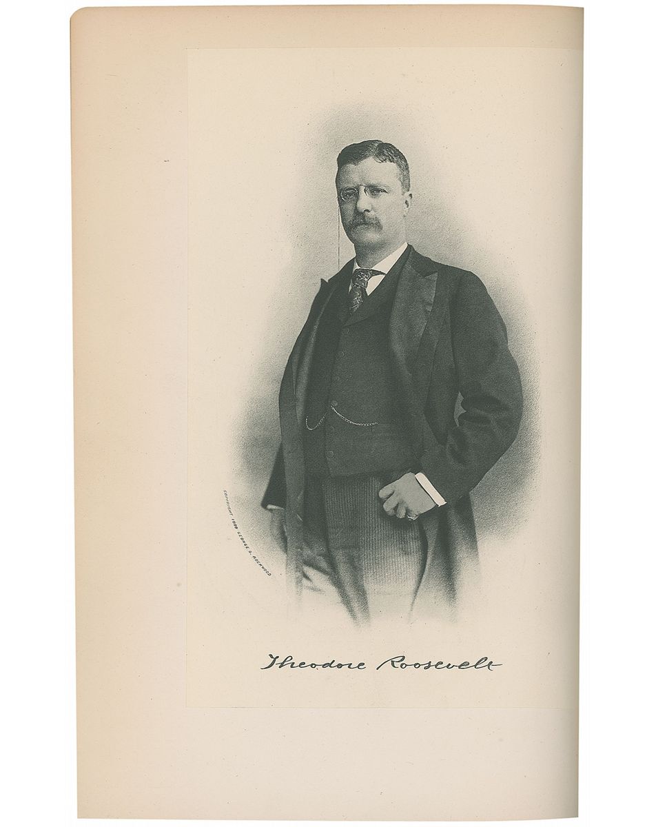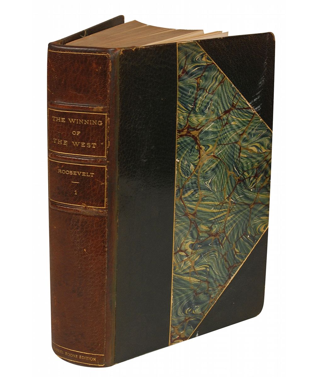 Handwritten partial manuscript, 8.5 x 13.75, permanently affixed by its top third onto a blank front flyleaf of a hardcover Daniel Boone edition (#64 of 200) of Volume I of The Winning of the West, New York & London: Knickerbocker Press, 1900.