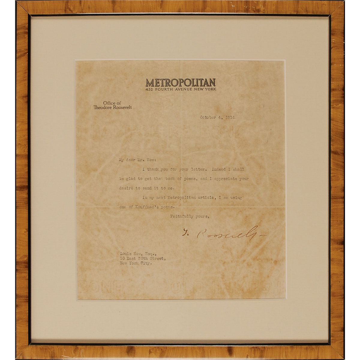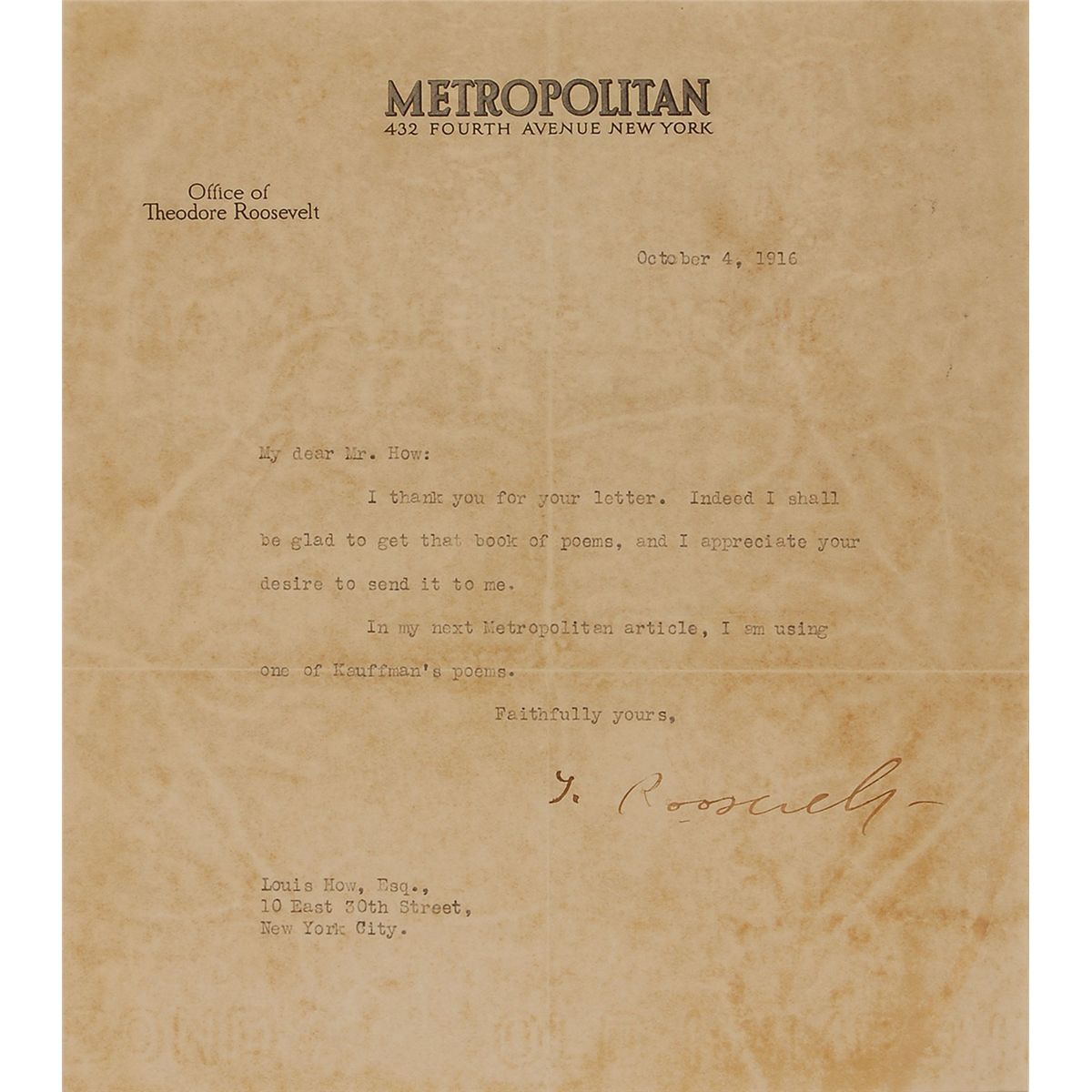 TLS signed “T. Roosevelt,” one page, 7.5 x 8.5, Metropolitan letterhead, October 4, 1916. Short letter to Louis How. In full: “I thank you for your letter. Indeed I shall be glad to get that book of poems, and I appreciate your desire to send it to me. In