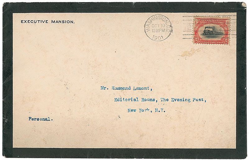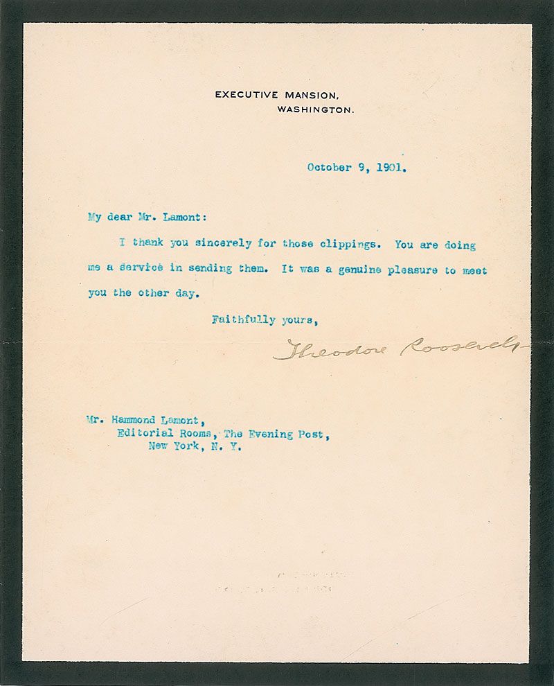 TLS as president, one page, 7.25 x 9, black-bordered Executive Mansion letterhead, October 9, 1901. Letter to Mr. Lamont of The Evening Post in New York. In full: “Thank you sincerely for those clippings. You are doing me a service in sending them. It was a genuine pleasure to meet you the other day.” Central horizontal fold passing through portion of signature, a mild shade of toning, and some trivial spreading to ink of text, otherwise fine condition. Accompanied by the original mailing envelope, marked “Personal.”