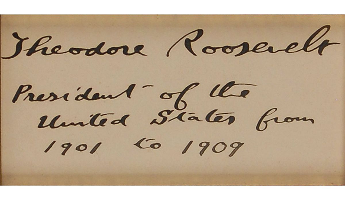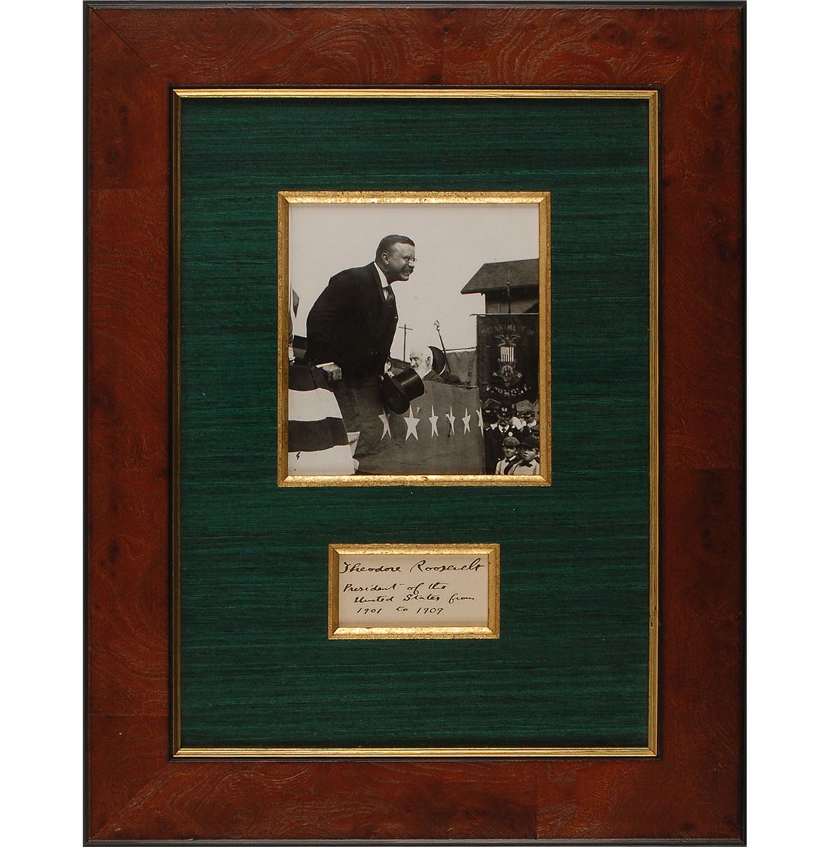 Bold ink signature, “Theodore Roosevelt, President of the United States from 1901 to 1909,” on an off-white card. Cloth-matted and framed with a portrait of Roosevelt on the campaign trail to an overall size of 14 x 18.25. In fine condition.