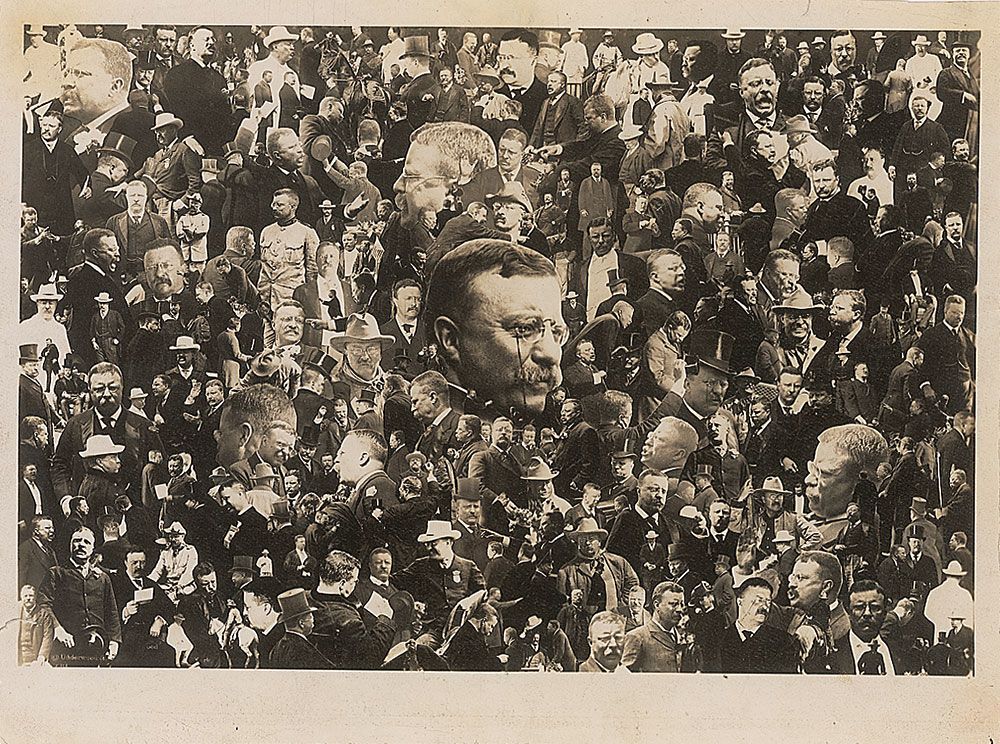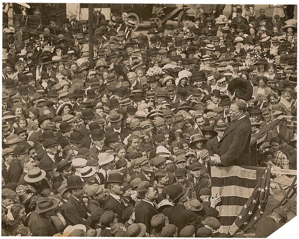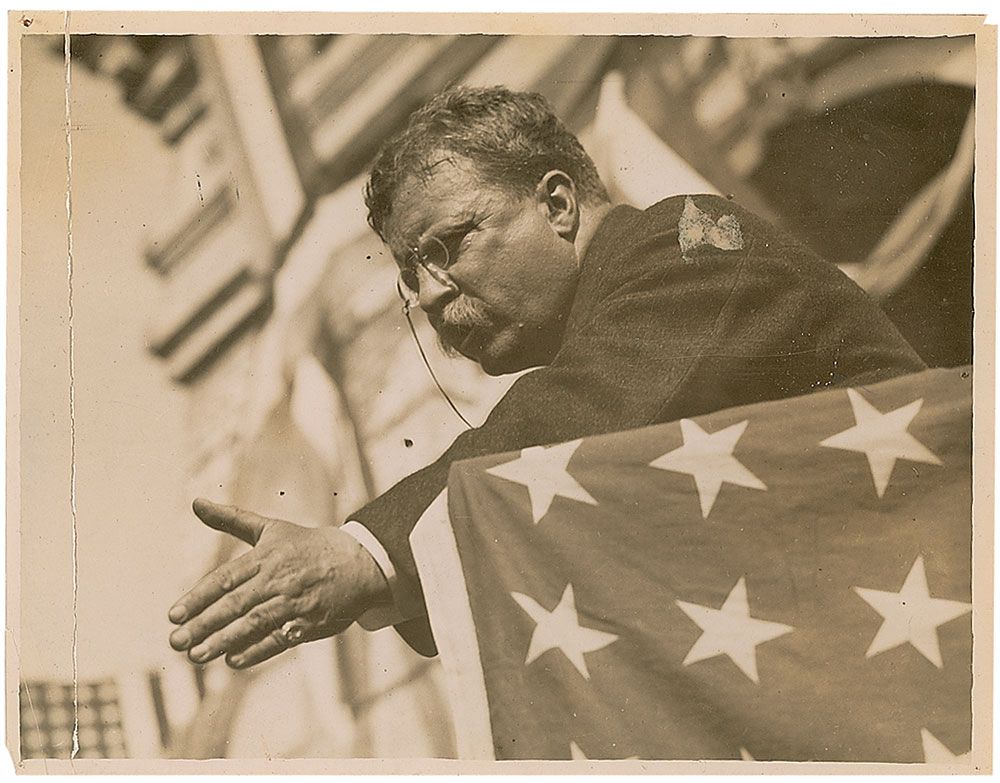 Four original vintage photos, ranging in size from 8.5 x 6.5 up to 10 x 8, and include images of of Roosevelt pointing emphatically from a flag-covered stage while in New Jersey on behalf of the Bull Moose Party; an Underwood and Underwood photo of Roosevelt waving his hat to a huge throng of people; an Underwood and Underwood photo of the outside of Sagamore Hill, taken the morning he passed away in 1919; and a composite photo of many various size images of Roosevelt by Underwood and Underwood. In very good overall condition.
