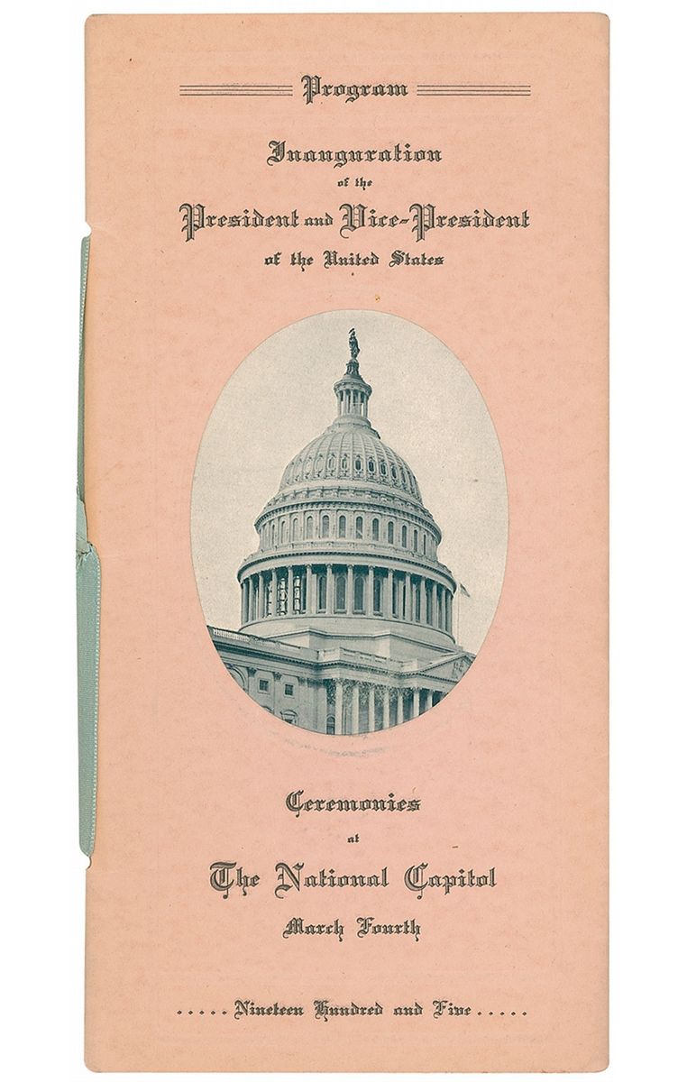 Unsigned program from Roosevelt’s presidential inauguration on March 4, 1905, 4.25 x 8.5, 8 pages, bearing an image of the Capitol on the front and information about the inauguration inside. The light blue binding ribbon remains fully intact. In fine condition, with a couple slight bends, mild toning to reverse, and ends of binding ribbon slightly frayed.