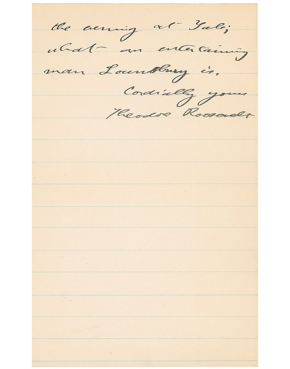 ALS, two pages, lightly-lined on two adjoining sheets, 5 x 8, United States Civil Service Commission letterhead, March 14, 1891. Letter to Professor Francis Wayland, Dean of the Yale Law School. In full: “I have just come back from New York and received your note. The address is Wm. Dudley Foulke, Swarthmore College. He is a very good fellow. I need not tell you how much I enjoyed my visit at your house and the evening at Yale; what an entertaining man Lounsbury is.” In fine condition.