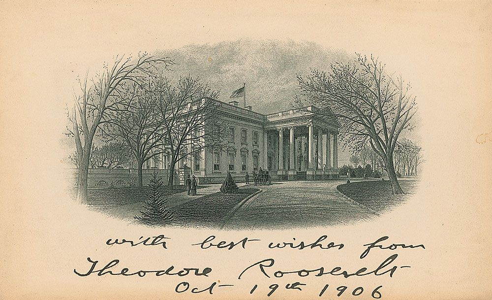 Engraved portrait of the exterior of the White House, 6 x 3.75, signed along the bottom as president, “With best wishes from Theodore Roosevelt, Oct. 19th, 1906.” In fine condition, with faint edge toning and likely trimmed edges. Roosevelt was awarded the Nobel Peace Prize in 1906 for his efforts in negotiating an end to the Russo-Japanese War.