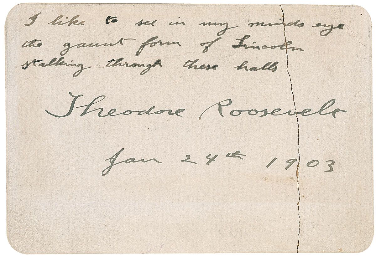 AQS on an off-white 6.5 x 4.5 card, signed as president, “Theodore Roosevelt, Jan. 24th 1903.” Roosevelt pens a historically remarkable quote. In full: “I like to see in my mind’s eye the gaunt form of Lincoln stalking through these halls.” Affixed to a slightly larger off-white cardstock sheet. A complete crack to the right portion of the card (passing through part of the quote and a single letter of the signature), a light crease, and some adhesive remnants or rubbing to borders, otherwise very good condition.