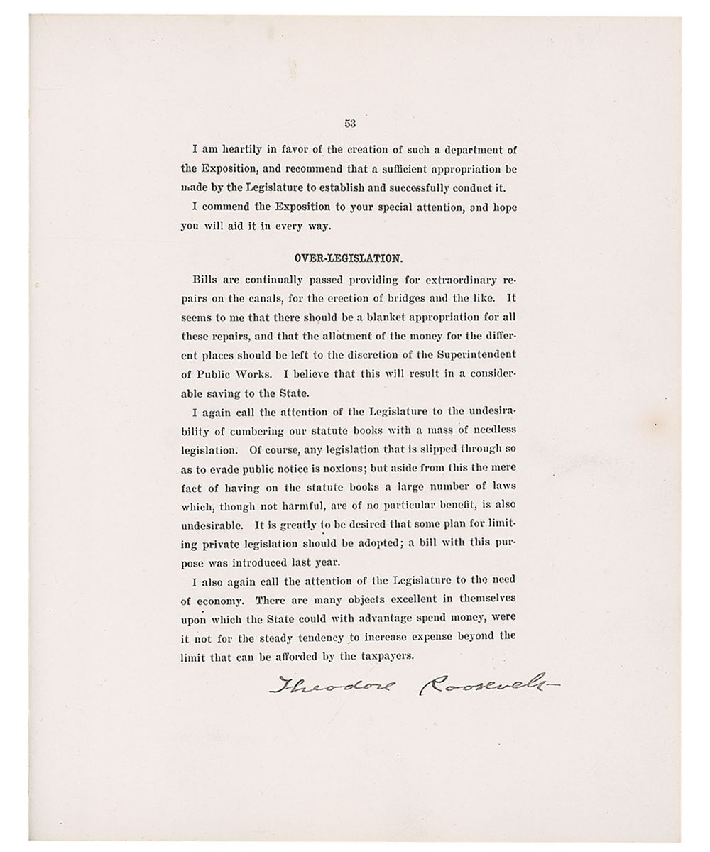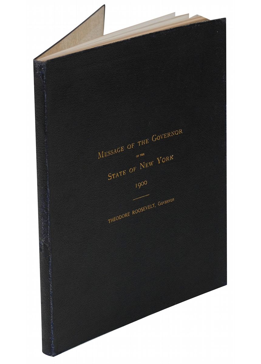 Printed transcript entitled “Message of the Governor of the State of New York, 1900,” 8.25 x 10.5, 53 pages, bound in soft Moroccan leather, signed on the final page in black ink. In fine condition, with some light toning to a few pages and pastedowns, and mild handling wear to covers.