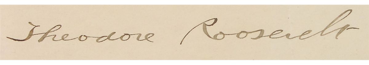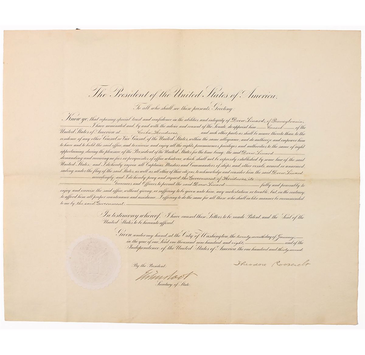 Partly-printed DS as president, one page, 22.75 x 18.75, January 27, 1908. Roosevelt appoints Drew Linard a “Consul of the United States of America at Ceiba, Honduras.” Signed at the conclusion by Roosevelt and countersigned by Secretary of State Elihu Root. In very good condition, with intersecting folds, one through a single letter of signature, some scattered light foxing, small mounting remnant to reverse, and some slight mirroring of ink from folding. The white wafer seal is just slightly worn and intact.