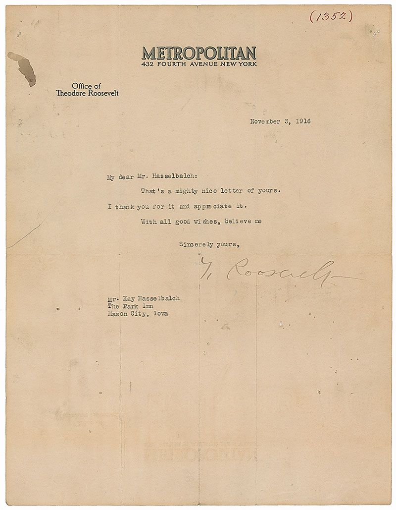 TLS signed “T. Roosevelt,” one page, 8.5 x 11, Metropolitan letterhead, November 3, 1916. Brief letter of thanks for a sent letter. In full: “That’s a mightily nice letter of yours. I thank you for it and appreciate it.” In very good condition, with intersecting folds, one through a single letter of signature, ink notation to top, pinholes to lower blank portion, and scattered soiling.