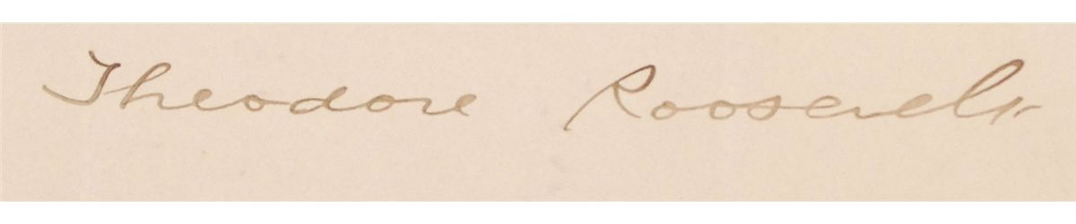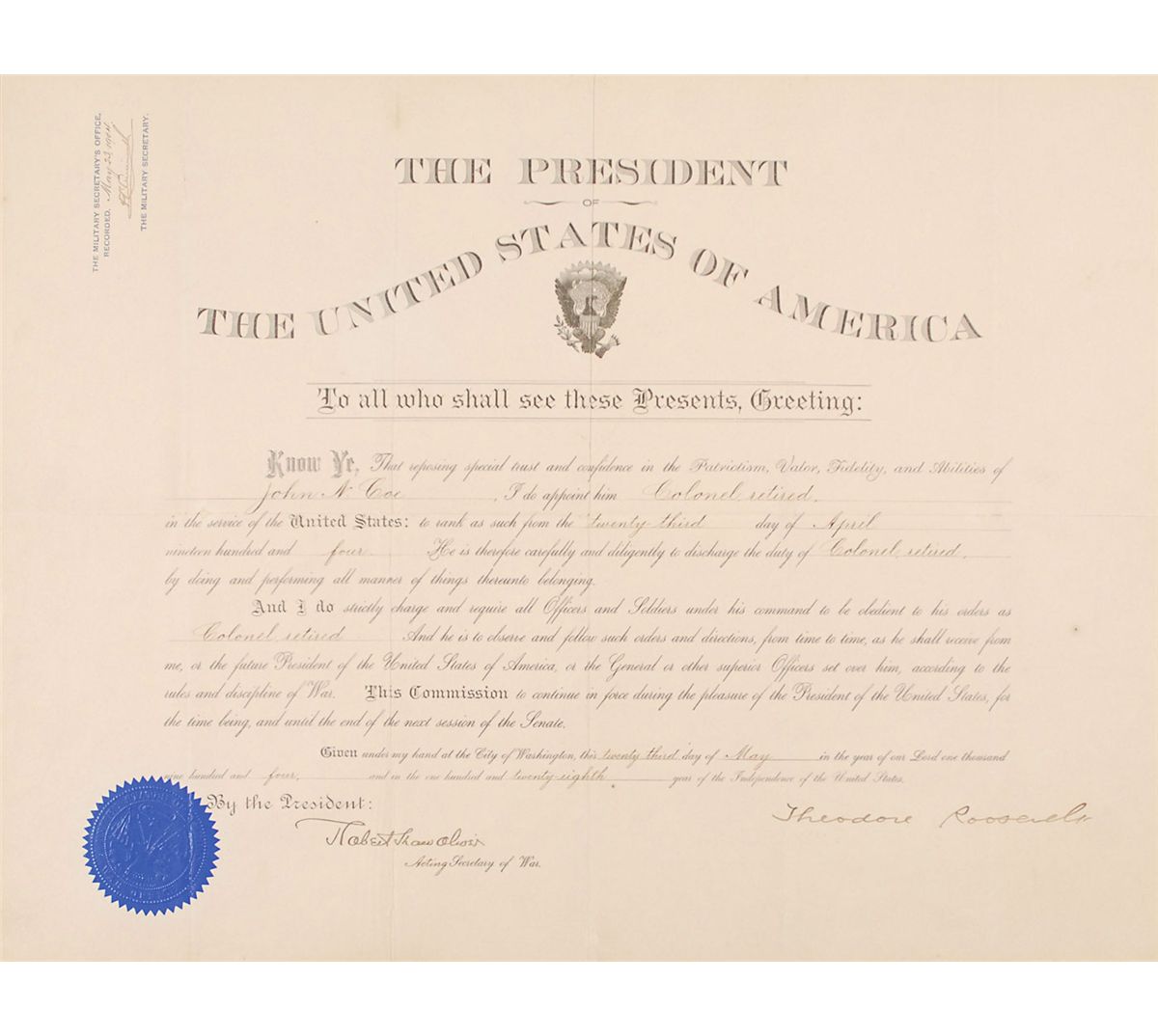 Partly-printed DS as president, one page, 20.25 x 15.5, May 23, 1928. President Roosevelt promotes John N. Coe to “Colonel, retired.” Signed at the conclusion by Roosevelt and countersigned by the acting secretary of war. Matted to an overall size of 23.5 x 19. Intersecting folds, with folds passing through two letters of signature and a uniform shade of mild toning, otherwise fine condition. The blue foil seal is crisp and intact. A beautiful full signature, measuring over five inches long.