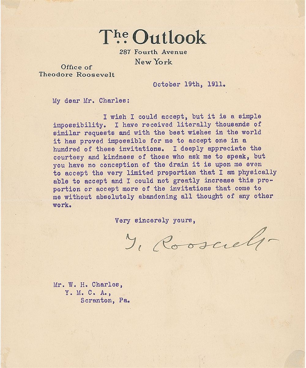 TLS signed “T. Roosevelt,” one page, trimmed to a size of 6.5 x 8, The Outlook letterhead, October 19, 1911. Letter declining a speaking engagement to a YMCA chapter. In part: “I deeply appreciate the courtesy and kindness of those who ask me to speak, but you have no conception of the drain it is upon me even to accept the very limited proportion that I am physically able to accept and I could not greatly increase this proportion or accept more of the invitations that come to me without absolutely abandoning all thought of any other work.” In fine condition, with trimmed edges and some scattered light creases.