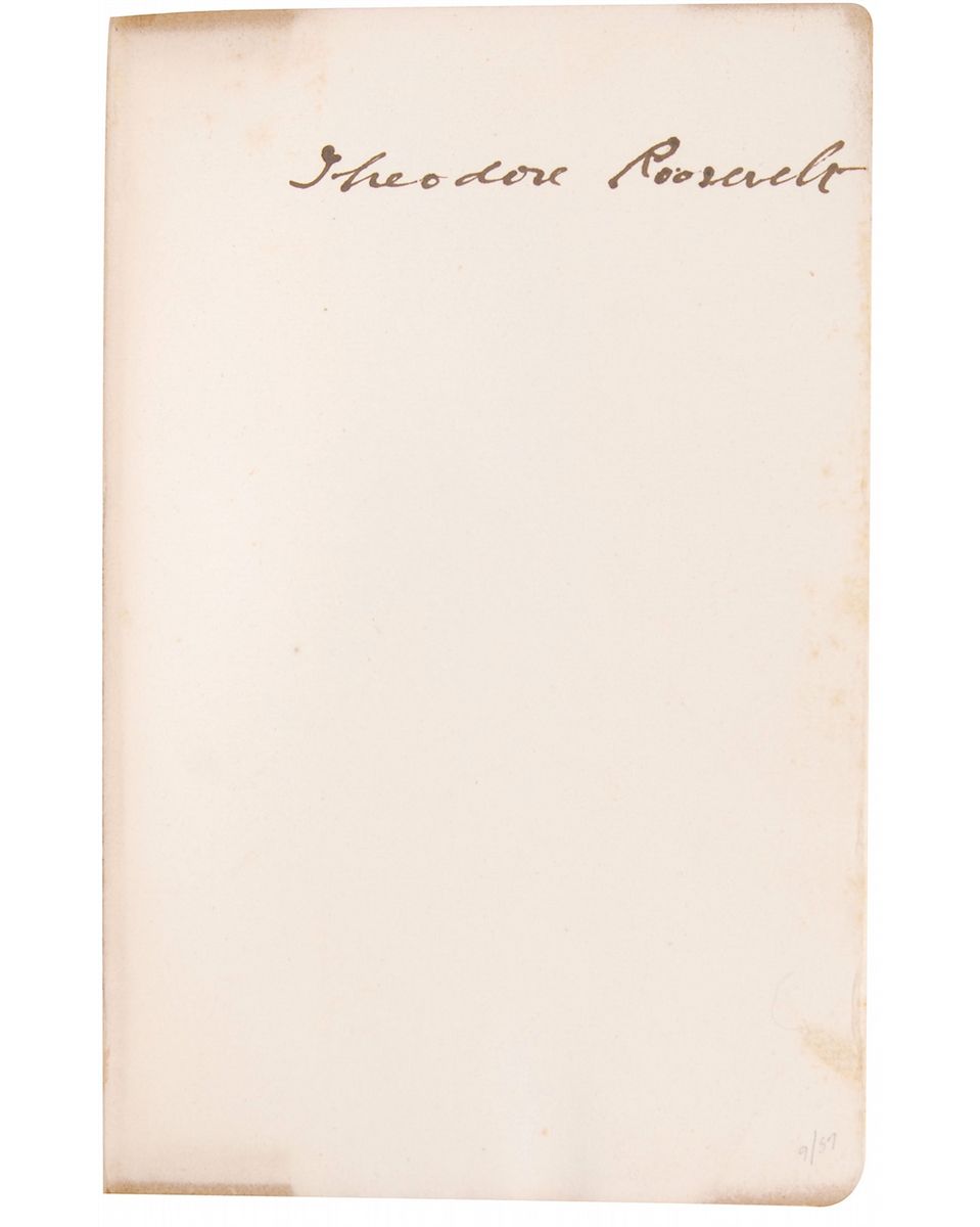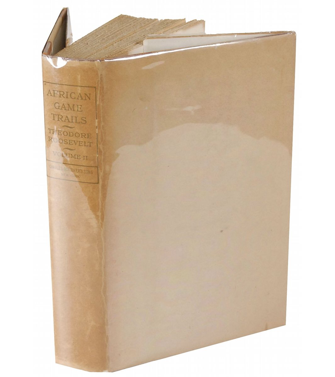 Signed book: African Game Trails, Volume II. Later printing. NY: Charles Scribner's Sons, 1910. Hardcover with dust jacket, 7 x 10, 529 pages. Boldly signed on the first free end page in black ink, “Theodore Roosevelt.” Autographic condition: some light soiling to edges of the signed page, otherwise fine. Book condition: VG-/VG.