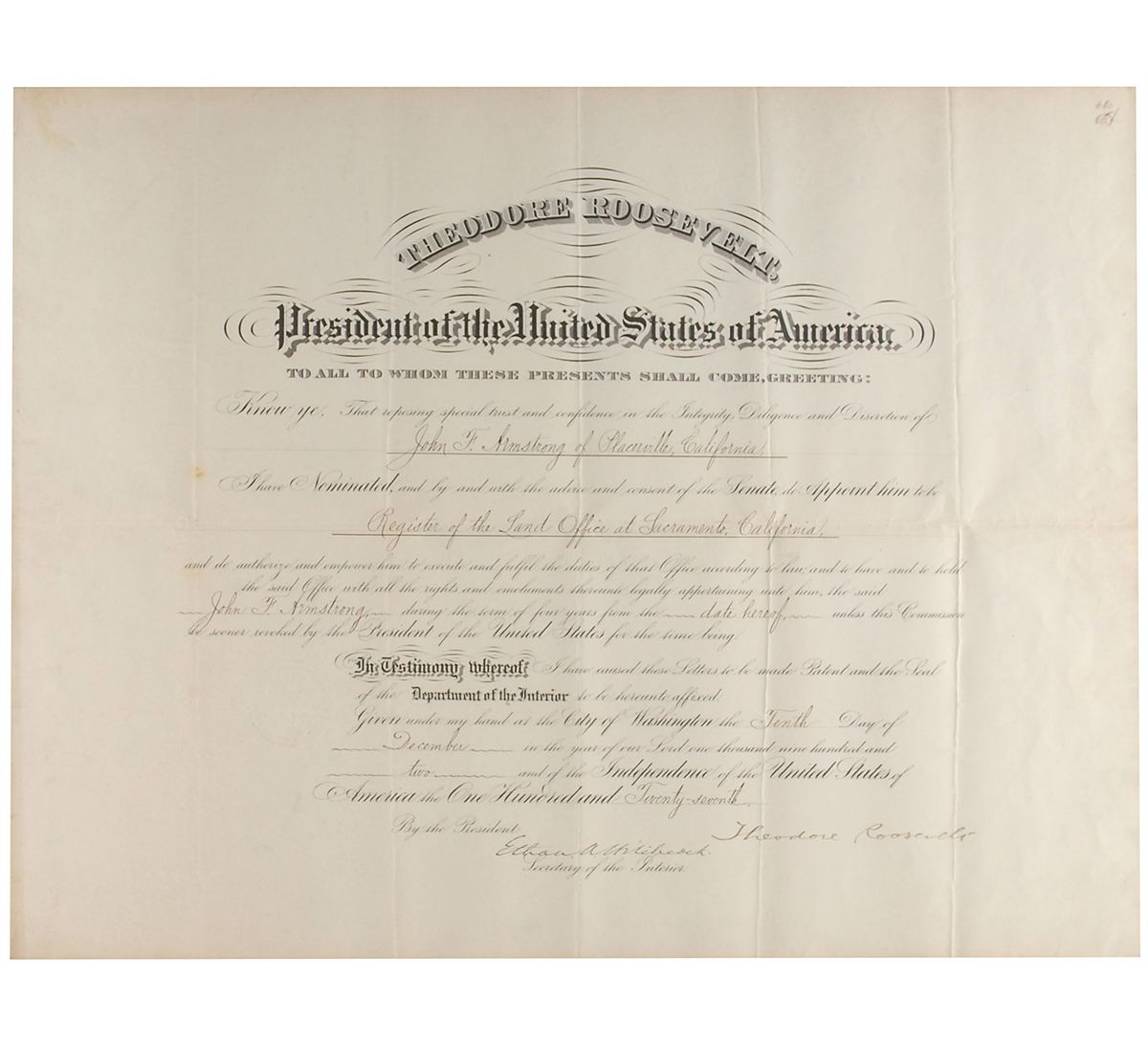Partly-printed DS as president, one page, 22 x 17, December 10, 1902. President Roosevelt appoints John F. Armstrong “to be Register of the Land Office at Sacramento, California.” Signed at the conclusion by Roosevelt and countersigned by Secretary of the Interior Ethan A. Hitchcock. Intersecting folds, one through a single letter of signature, and some scattered light toning and soiling, otherwise fine condition.