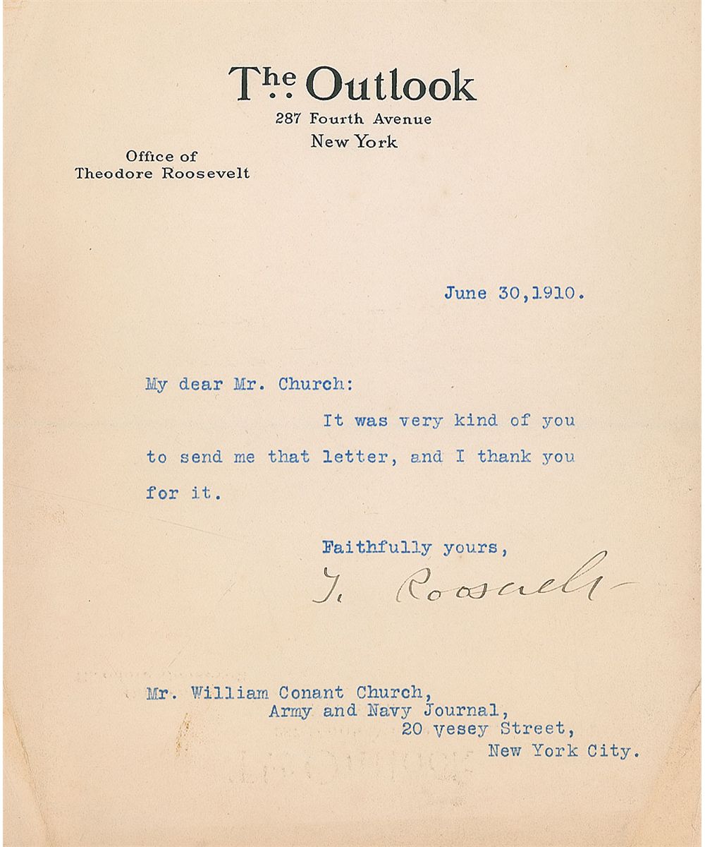 TLS signed “T. Roosevelt,” one page, 6.25 x 7.75, The Outlook letterhead, June 30, 1910. Letter to William Conant Church of the Army and Navy Journal. In full: “It was very kind of you to send me that letter, and I thank you for it.” In fine condition, with trivial soiling and creases to corners. Accompanied by Church’s retained copy of his letter to Roosevelt, informing him of political happenings that had occurred while he was on an expedition in Africa.