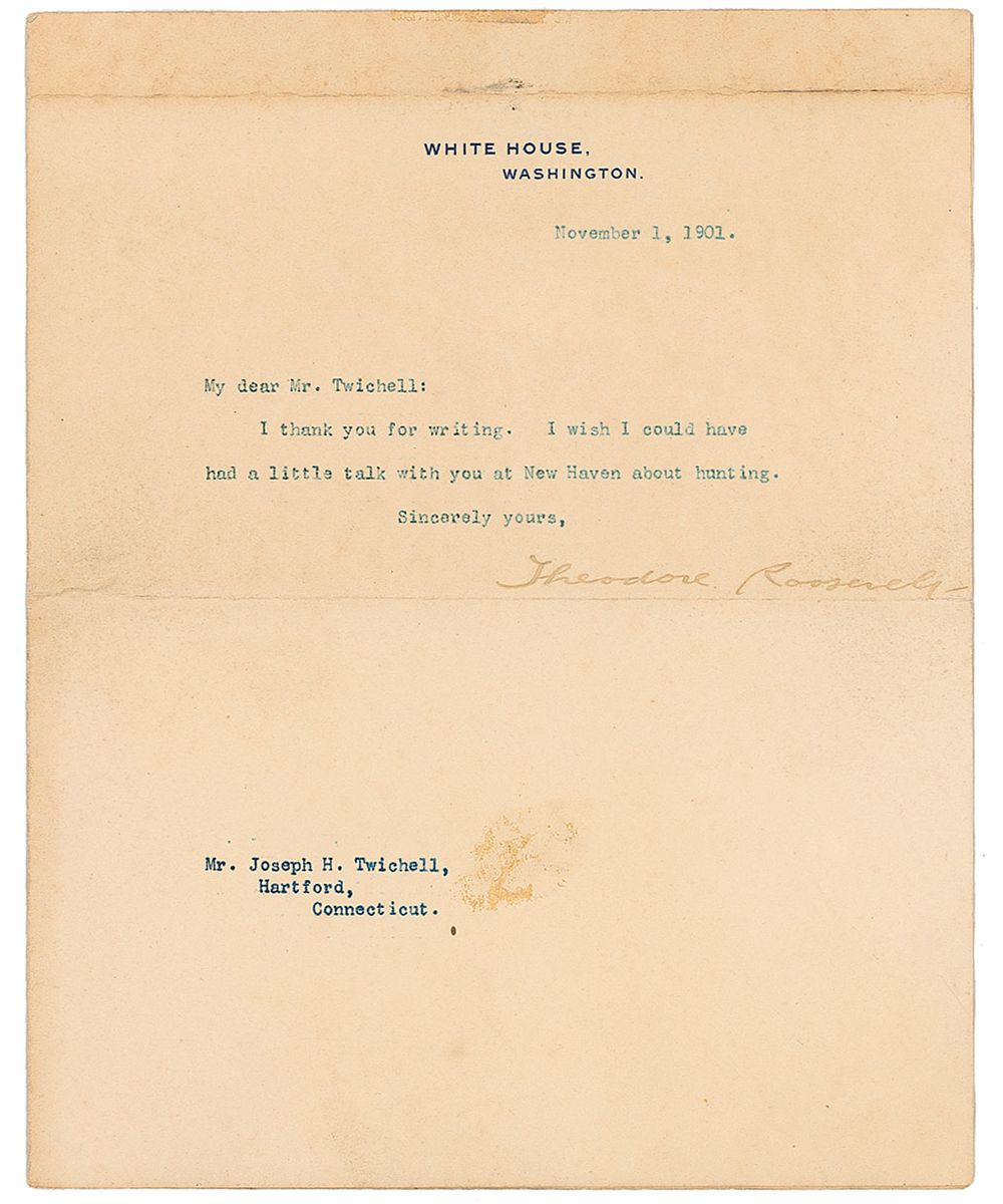 TLS as president, one page, 7 x 9, White House letterhead, November 1, 1901. Brief letter to Joseph Twichell. In full: “I thank you for writing. I wish I could have had a little talk with you at New Haven about hunting.” In very good condition, with Roosevelt’s signature uniformly light, but still legible, mild overall toning, a small area of adhesive remnant to lower blank portion, and mounting remnants to reverse of second integral page. Accompanied by the original mailing envelope. Twichell was a writer, Civil War veteran, and pastor who had a decades-long friendship with Samuel Clemens, and appears in A Tramp Abroad as Harris.