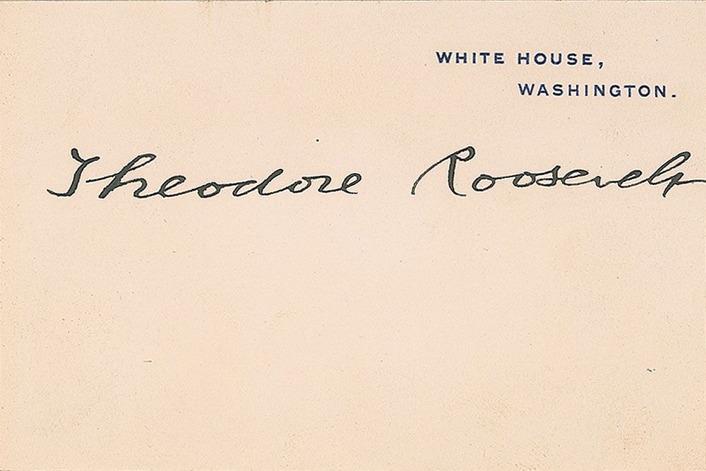 Appealing White House card, signed in bold black ink, “Theodore Roosevelt.” In fine condition, with a small paperclip impression to top edge and three strands of adhesive to reverse from previous mounting.