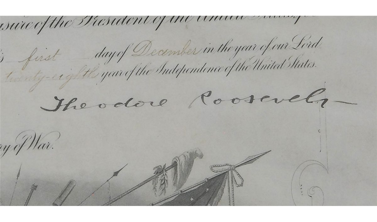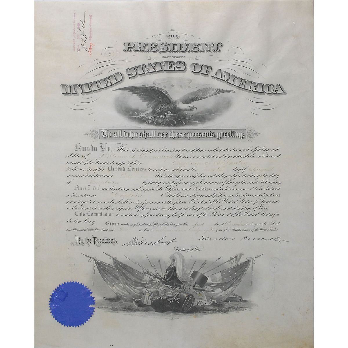 Partly-printed DS as president, one page, 15.75 x 19.75, December 1, 1903. President Roosevelt appoints William A. Cavenaugh a “Captain of Infantry in service of the United States.” Boldly signed at the conclusion by Roosevelt, and countersigned by Secretary of War Elihu Root. In fine condition, with some light wrinkles, handwritten portions of document fairly light, but still legible, and a few light creases. The blue seal is worn, with a light stain and small area of paper loss. Cavenaugh was a highly-decorated soldier, earning several medals and participating in the Philippine Insurrection, Mexican Occupation, and World War I.