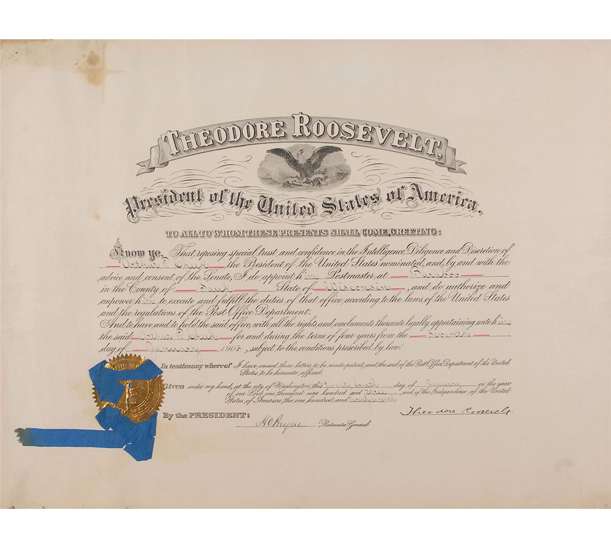 Partly-printed DS as president, one page, 22 x 17, January 24, 1903. President Roosevelt appoints Arthur P. Cheek “Postmaster at Baraboo, in the County of Sauk, State of Wisconsin.” Signed at the conclusion by Roosevelt and countersigned by Postmaster General Henry C. Payne. In fine condition, with a bit of light toning from ribbon and curled edges from having previously been rolled. The gold foil seal is crisp and intact and retains its original blue ribbons.