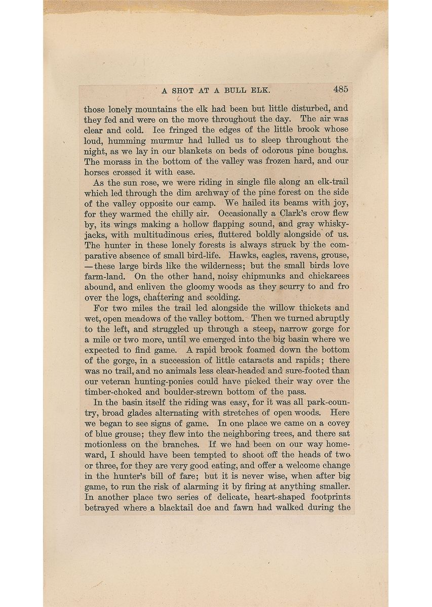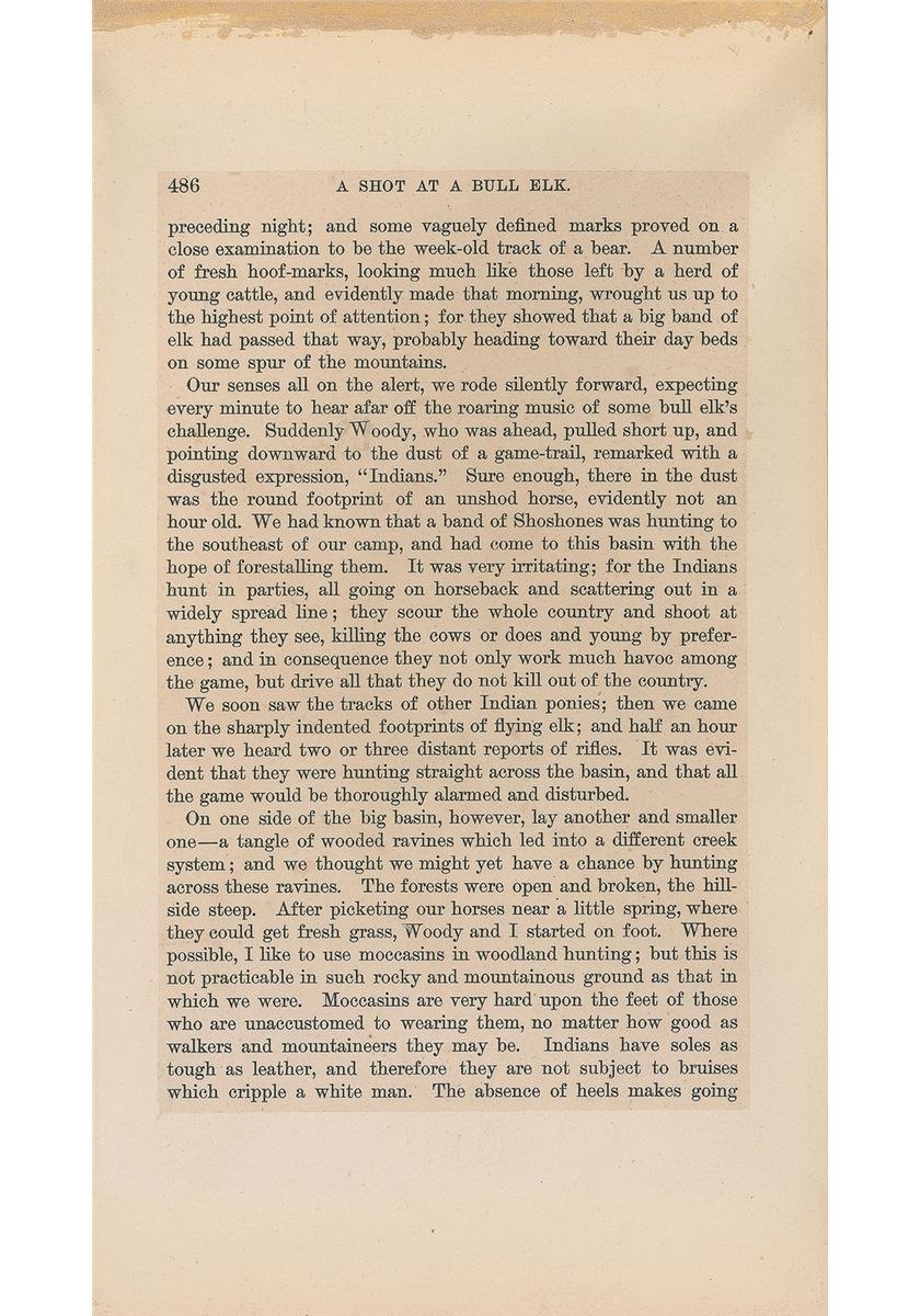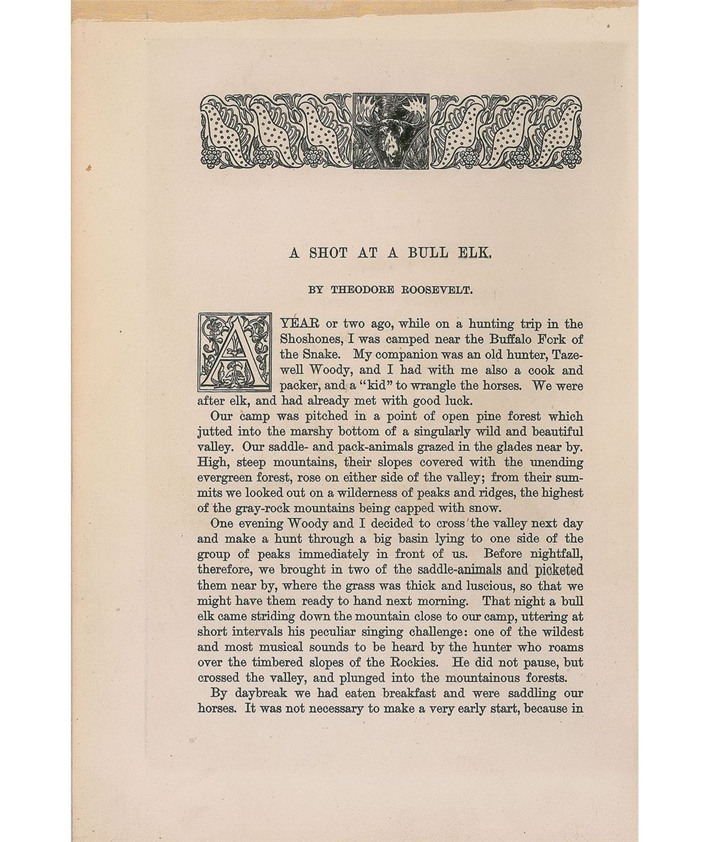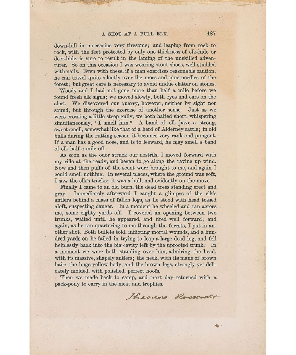 A printed article written by Roosevelt entitled ‘A Shot at a Bull Elk,’ four pages, each affixed to a separate 8 x 11 board, signed at the conclusion in dark ink, “Theodore Roosevelt.” Light overall blocks of toning, otherwise fine condition.