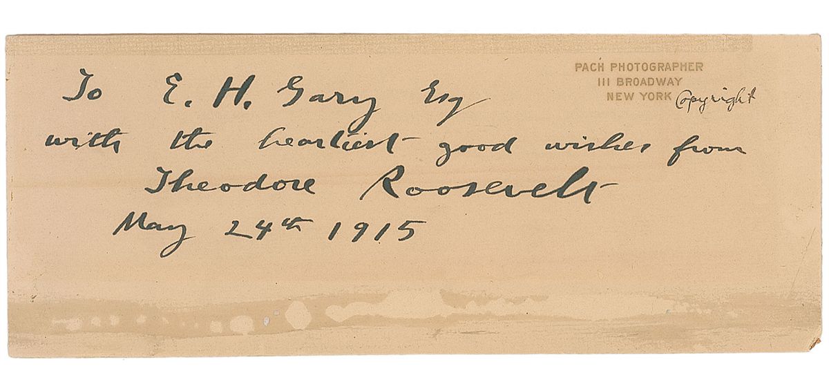 Ink signature and inscription, “To E. H. Gary Esq, with the heartiest good wishes from Theodore Roosevelt, May 24th, 1915,” on an off-white 8.75 x 3.5 card clipped from the mount of a photograph. In fine condition, with adhesive remnants to top and bottom edges.
