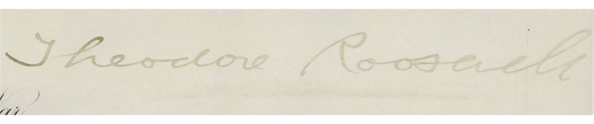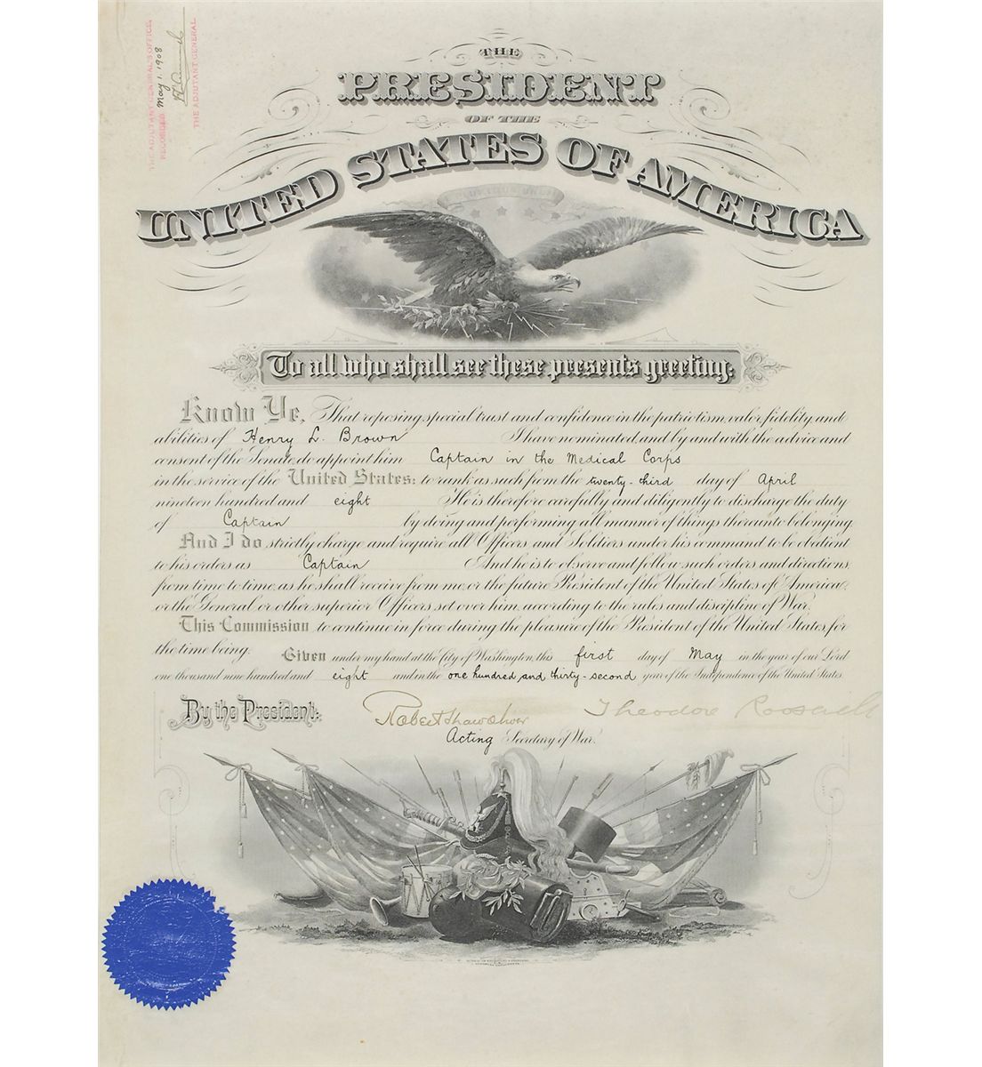 Partly-printed DS as president, one page, 13.5 x 8.5, May 1, 1908. President Roosevelt appoints Henry L. Brown a “Captain in the Medical Corps in the service of the United States.” Signed at the bottom by Roosevelt and countersigned by Acting Secretary of War Robert Shaw Oliver. In fine condition, with some light wrinkling, very mild spotting along top, and some light rubbing above Oliver’s signature. Captain brown served on the medical staff at Fort Riley in Kansas, and later participated in the hunt for Pancho Villa.