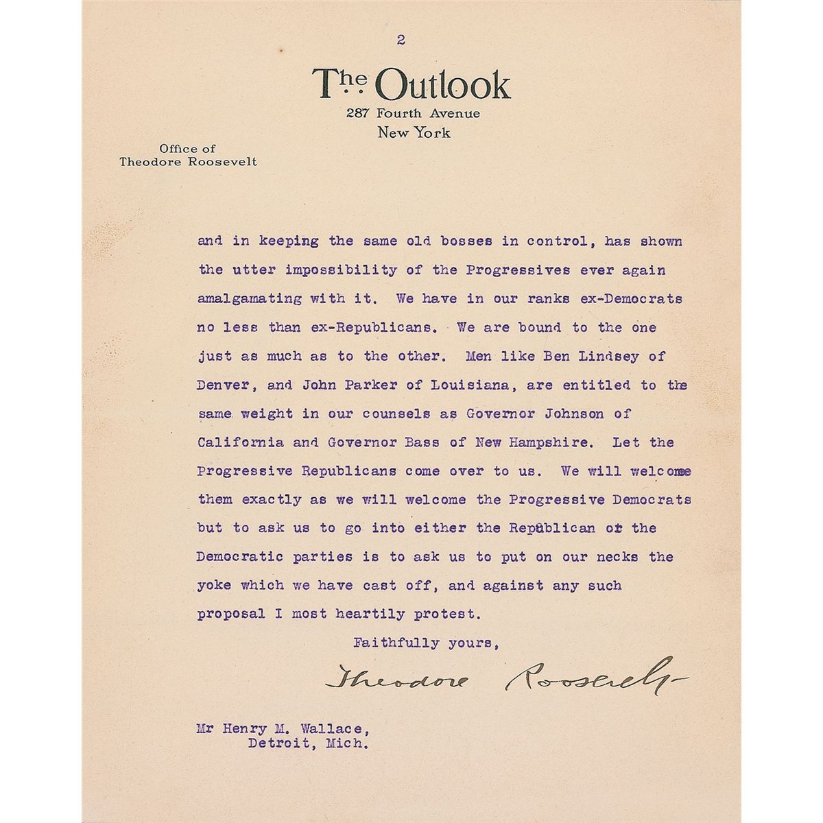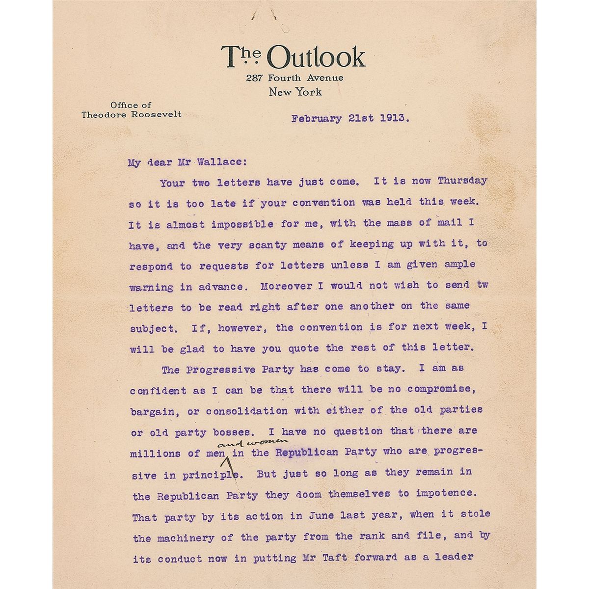 TLS, two pages, 7.75 x 9.5, The Outlook letterhead, February 21, 1913. Letter to Henry M. Wallace, a Detroit businessman and member of the National Progressive Committee for Michigan. In part: “The Progressive Party has come to stay. I am as confident as I can be that there will be no compromise, bargain, or consolidation with either of the old parties or old party bosses. I have no question that there are millions of men [and women, added in his own hand] in the Republican Party who are progressive in principle. But just so long as they remain in the Republican Party they doom themselves to impotence. That party by its action in June last year, when it stole the machinery of the party from the rank and file, and by its conduct now in putting Mr. Taft forward as a leader and in keeping the same old bosses in control, has shown the utter impossibility of the Progressives ever again amalgamating with it…Let the Progressive Republicans come over to us. We will welcome them exactly as we will welcome the Progressive Democrats but to ask us to go into either Republican or the Democratic parties is to ask us to put on our necks the yoke which we have cast off, and against any such proposal I most heartily protest.” In fine condition. After failing to win the Republican nomination for reelection as president in 1912, Roosevelt left and formed the Progressive Party, also known as the Bull Moose Party, with a platform of strong government regulation to protect workers and the middle class, and called for women’s suffrage, environmental conservation, and social welfare programs, among other things. Though he had chosen Taft as his Republican successor, Roosevelt became displeased with his policies and turned against him. A spectacular letter outlining Roosevelt’s steadfast political convictions in the aftermath of his presidency.