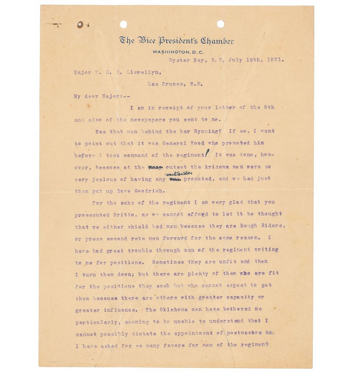 TLS as vice president, three pages, 8 x 10.5, The Vice President’s chamber letterhead, July 13, 1901. Letter to Major William H. H. Llewellyn, who served under Roosevelt in the Rough Riders during the Spanish-American War. In part: “For the sake of the regiment I am very glad that you prosecuted Britto [sic], as we cannot afford to let it be thought that we either shield bad men because they are Rough Riders or press second rate men forward for the same reason. I have had great trouble through men of the regiment writing to me for positions. Sometimes they are unfit and then I turn them down; but there are plenty of them who are fit for the positions they seek but who cannot expect to get them because there are others with greater capacity or greater influence. The Oklahoma men have bothered me particularly, seeming to be unable to understand that I cannot possibly dictate the appointment of postmasters &c. I have asked for so many favors for men of the regiment that I am positively ashamed to go to a single department in Washington, and above all, to the War Department. Yet each trooper not unnaturally when he writes me thinks his own is the only case, and that if I chose to, I can surely do anything he wants.