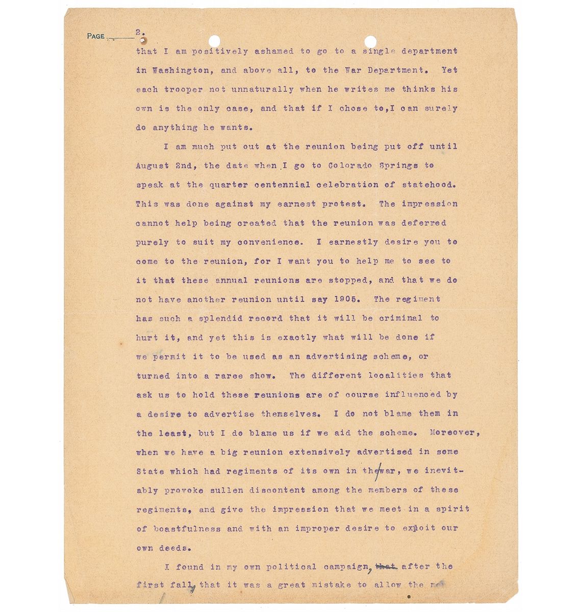 I am much put out at the reunion being put off until August 2nd, the date when I go to Colorado Springs to speak at the quarter centennial celebration of statehood. This was done against my earnest protest. The impression cannot help being created that the reunion was deferred purely to suit my convenience. I earnestly desire you to come to the reunion, for I want you to help me to see to it that these annual reunions are stopped, and that we do not have another reunion until say 1905. The regiment has such a splendid record that it will be criminal to hurt it, and yet this is exactly what will be done if we permit it to be used as an advertising scheme…Moreover, when we have a big reunion extensively advertised in some State which had regiments of its own in the war, we inevitably provoke sullen discontent among the members of these regiments, and give the impression that we meet in a spirit of boastfulness and with an improper desire to exploit our own deeds…