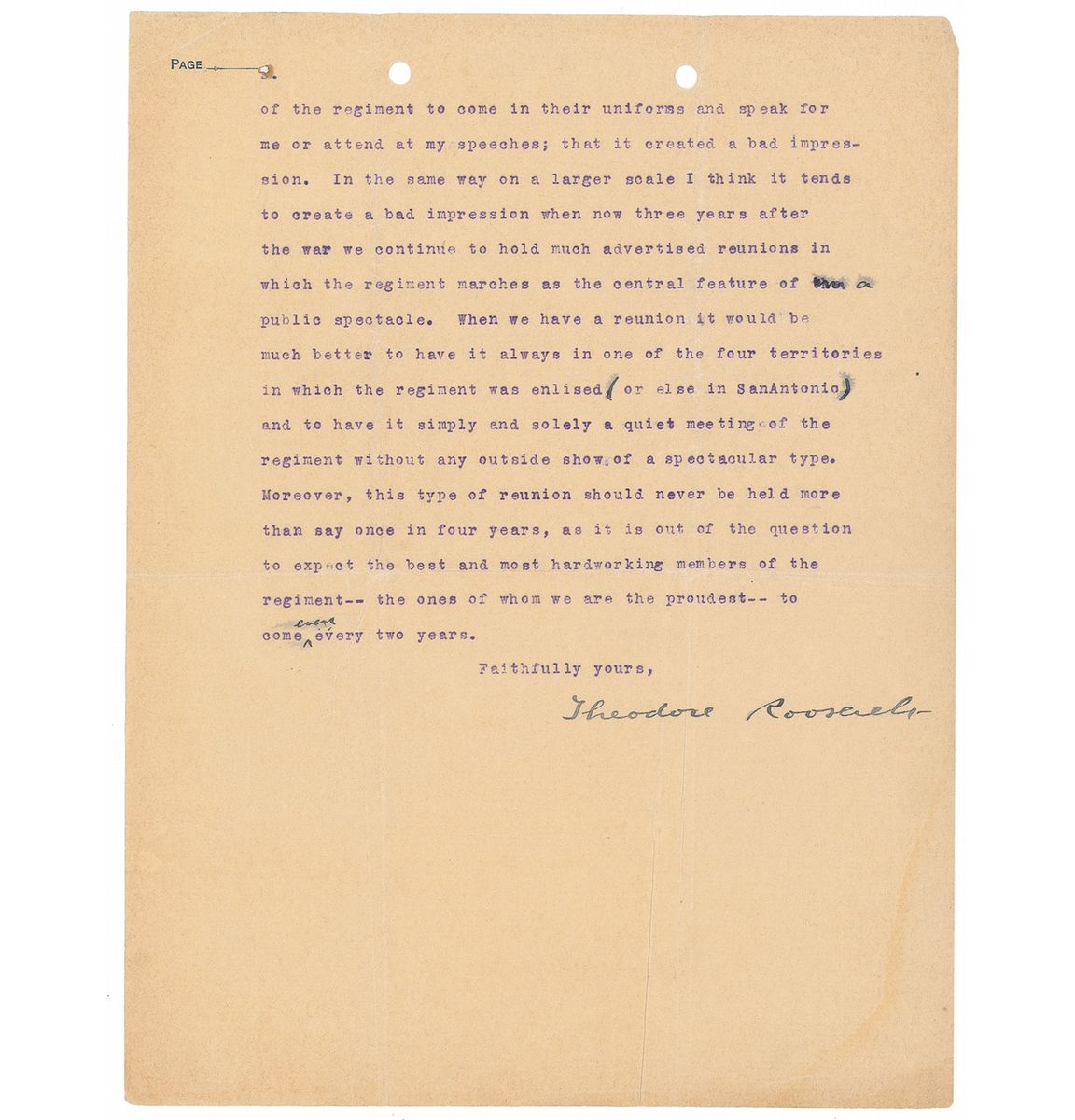 Rife with excellent content, this letter demonstrates Roosevelt's close affinity for his legendary force of 'Rough Riders'—even later, after two terms as President, he still preferred to be called ‘Colonel Roosevelt,’ and considered the charge on San Juan Hill as ‘the great day of my life.’ As requested, the 1905 reunion was indeed held in San Antonio and Roosevelt—now president—attended. Despite his pride in the group, he was keenly aware of public perception and feared sullying its legacy—and his own—by showing any blatant favoritism toward his men. Roosevelt relied on Llewellyn, who had been rewarded for his valor with a post as US attorney in New Mexico, to keep him up to date on veterans of the Rough Riders. Here, Roosevelt references Frank Brito, a former Rough Rider who had been convicted of murder in the third degree for killing his sister-in-law—although, in fact, he intended to shoot his wife. In addition to office-seekers, Roosevelt was plagued by those who were in precarious positions; in his autobiography, he described the minority of the Rough Riders ‘who in certain ways were unsuited for a life of peaceful regularity…It was from these men that letters came with a stereotyped opening which always caused my heart to sink—‘Dear Colonel: I write you because I am in trouble.’’ All together, this is a fabulous letter that offers an insider's perspective of Roosevelt's postwar experiences with the Rough Riders, extolling both the flaws and virtues of leading such a storied group of soldiers.