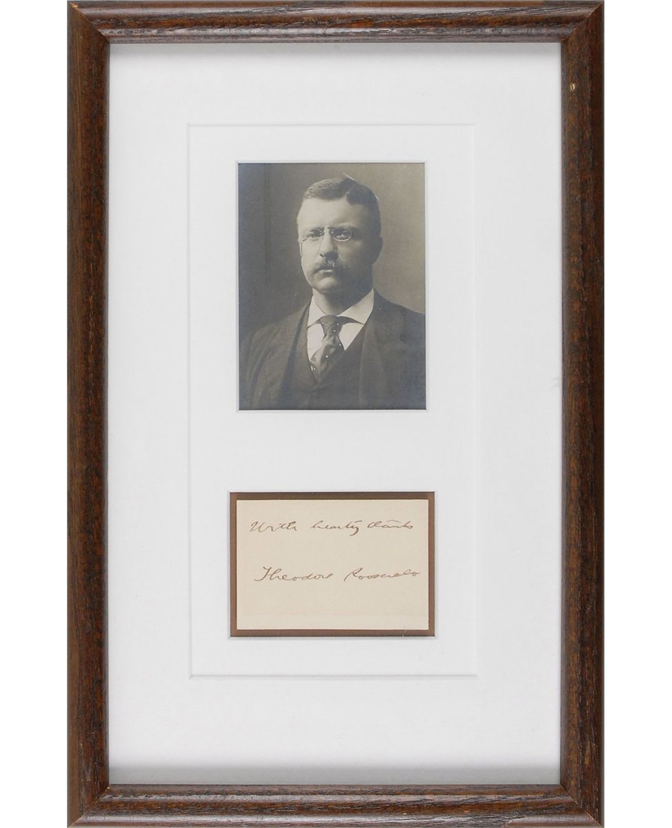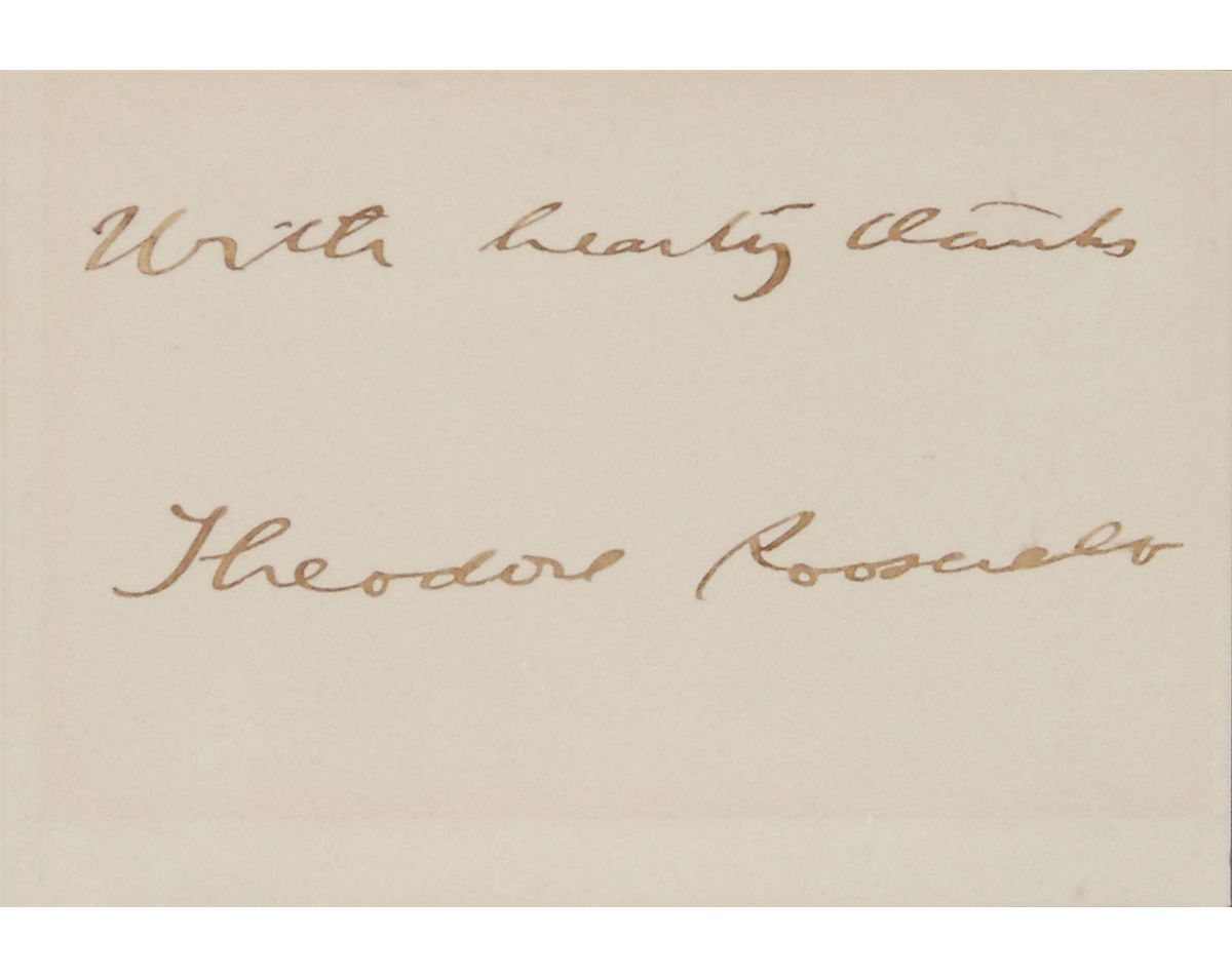 Ink signature, “With hearty thanks, Theodore Roosevelt,” on an off-white 3 x 2.25 sheet. Double-matted and framed with a portrait of Roosevelt to an overall size of 9 x 14. In fine condition, with a mild shade of overall toning.