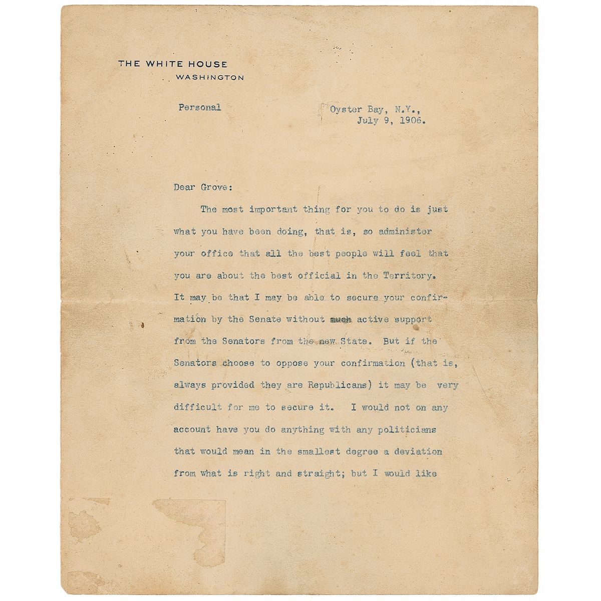 TLS as president, two pages, 7 x 8.75, White House letterhead, July 9, 1906. Letter to Grosvenor A. Porter, a cousin of Edith K. Roosevelt. In full: “The most important thing for you to do is just what you have been doing, that is, so administer your office that all the best people will feel that you are about the best official in the Territory. It may be that I may be able to secure your confirmation by the Senate without much active support from the Senators from the new State. But if the Senators choose to oppose your confirmation (that is, always provided they are Republicans) it may be very difficult for me to secure it. I would not on any account have you do anything with any politicians that would mean in the smallest degree a deviation from what is right and straight; but I would like to have you identify yourself as far as is proper with the Republican organization, and let it be known that you are delighted to do what you can for all the heads of the organization, without regard to faction, so long as what they desire you to do is entirely straight.” He adds a handwritten closing sentence, “But the last proviso is all important.” Tape-repaired edge separations to the horizontal mailing fold (passing through his very faded last name in the signature), scattered creases, considerable soiling, and adhesive remnants to blank area of the first page, otherwise very good condition. On September 17, 1907, the people of the Indian and Oklahoma Territories voted favorably to combine the two territories to form the State of Oklahoma. Of the seven congressmen they elected—two to the Senate and five to the House of Representatives—only one was a Republican. Roosevelt nominated Porter to be reappointed as US Marshal for the Eastern District of Oklahoma, but it never got out of committee after charges of immorality and misconduct were made; rather than have the nomination rejected, Roosevelt withdrew it entirely.