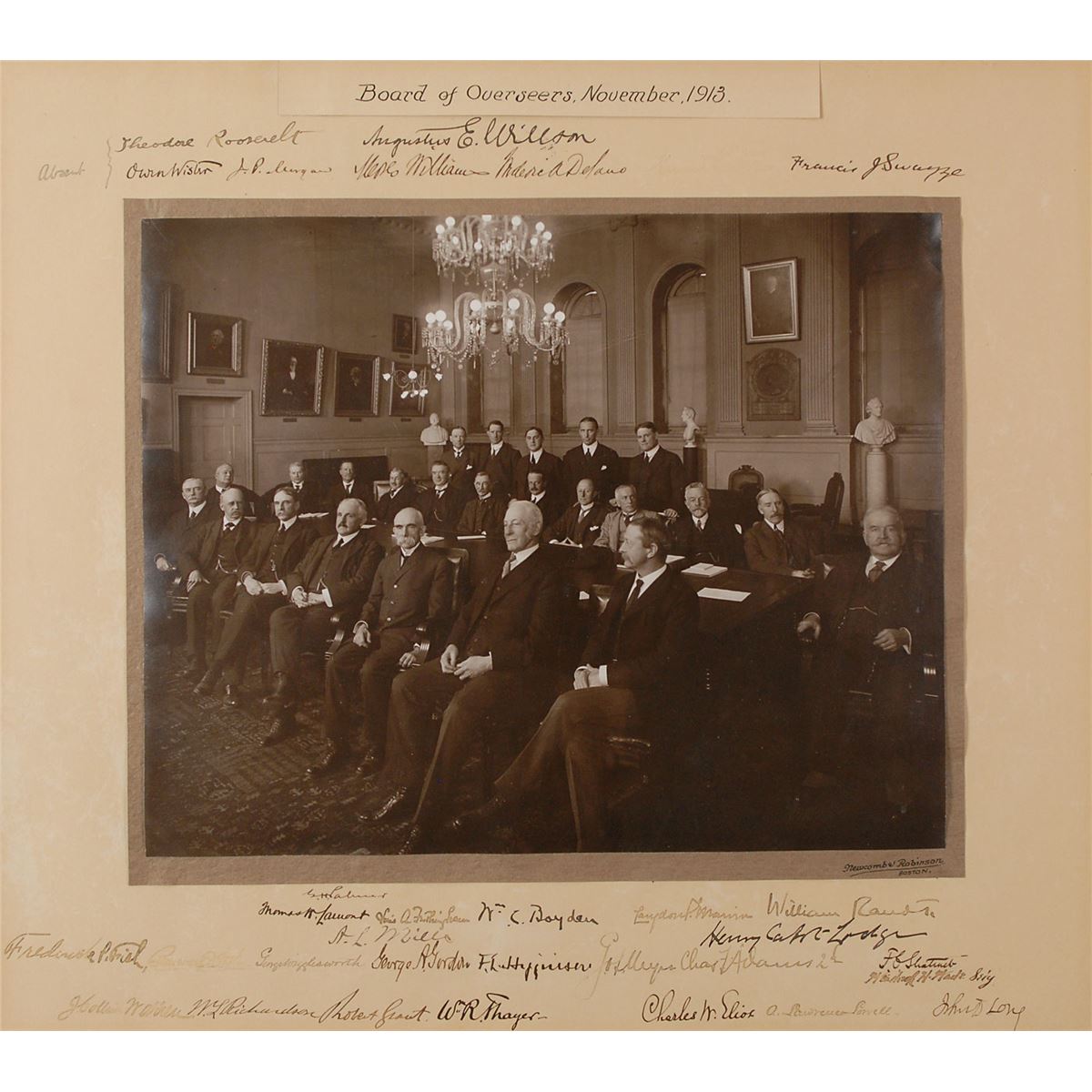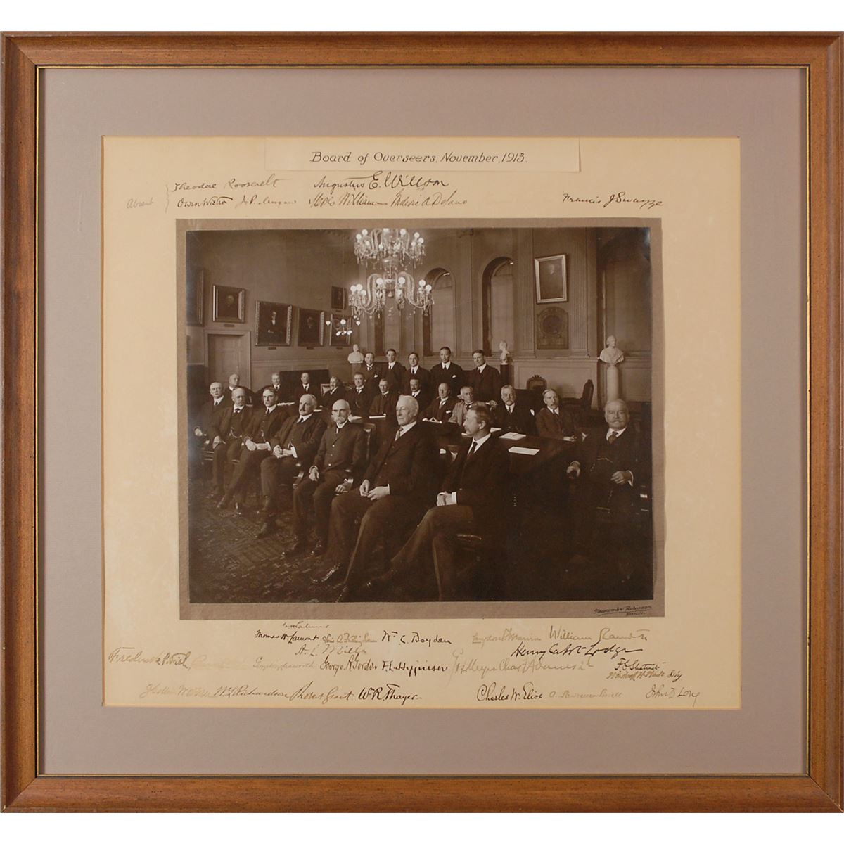 Impressive matte-finish 13 x 10.25 photo of the Harvard Board of Overseers taken in November 1913 by Newcombe & Robinson of Boston, affixed to its original 17.75 x 15.75 mount, signed on the mount in black ink by Roosevelt in the upper left, along with thirty other members of the board, among them Owen Wister, J. P. Morgan, Jr., Frederic Adrian Delano, Henry Cabot Lodge, Charles Francis Adams II, Augustus E. Willson, Thomas W. Lamont, and Charles W. Eliot. Matted and framed to an overall size of 23.5 x 21.5. Scattered surface dings and toning to the mount, and a few signatures quite faded (Roosevelt’s remains strong and bold), otherwise fine condition. This great photo is signed by all twenty-four members of the board shown in the image, who sign on the lower portion of the mount, while the seven absent from the meeting—and thus not depicted—sign above. Roosevelt is among the latter, as at that time he was then traveling in Brazil preparing for his storied Roosevelt–Rondon Scientific Expedition through the Amazon rainforest. He had attended Harvard from 1876 to 1880 where he studied biology intently, participated in rowing and boxing, and served as an editor of The Harvard Advocate. An uncommon oversized photo signed by the former president and a diverse assortment of his contemporaries from many different fields.
