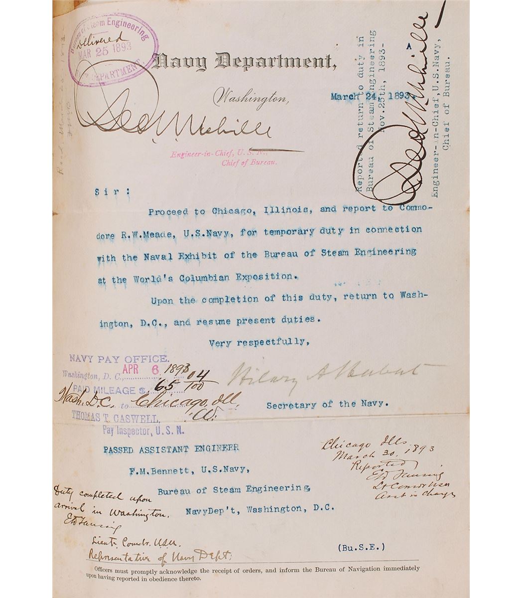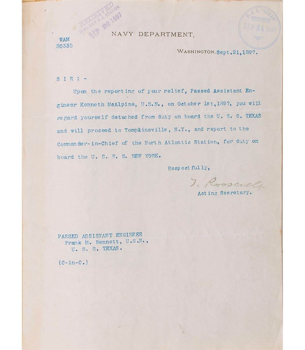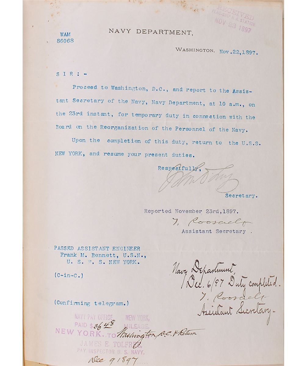 Archive of letters sent to Captain Frank M. Bennett, comprised of over 150 letters and documents contained within a 9 x 13 binder, including two signed by Theodore Roosevelt during his time as assistant secretary of the Navy. The first, signed twice, “T. Roosevelt,” one page, Navy Department letterhead, November 22, 1897, in part: “Proceed to Washington, D.C., and report to Assistant Secretary of the Navy…for temporary duty in connection with the Board on the Reorganization of Personnel of the Navy.” Signed at the conclusion by Secretary of the Navy John D. Long and signed twice by Roosevelt, noting when Bennett reported for duty and completed his duty. The second, signed “T. Roosevelt,” one page, Navy Department letterhead, September 21, 1897, in part: “Upon the reporting of your relief…report to the Commander-in-Chief of the North Atlantic Station, for duty on board the U.S.F.S. New York.” The archive as a whole spans 1878 to 1901, and other notable signers include: George W. Melville, Winfield Scott Schley, Benjamin F. Tracy, Edward D. Taussig, Hilary A. Herbert, John R. Lynch, William C. Whitney, William E. Chandler, William H. Hunt, and many by Bennett himself. In overall very good to fine condition. Bennett was a career Navy officer who began his service as an engineer in 1879. He served on several different ships and was briefly detached for special duty at the Paris Exposition in September 1898. On April 30, 1917, shortly after the United States entered World War I, Bennett assumed the duties of Commander, Division 4, Atlantic Fleet, with his flag onboard USS Minnesota. A historically interesting and substantial archive highlighted by the presence of two Roosevelt letters.