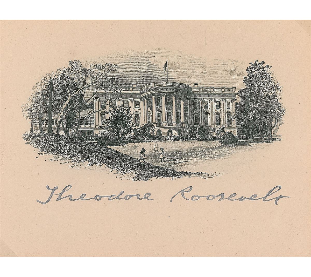 Engraved portrait of the exterior of the White House, 4.75 x 3, signed under the image in fountain pen. Removably corner-mounted to an 8.5 x 11 presentation sheet bearing an image of Roosevelt. In fine condition.