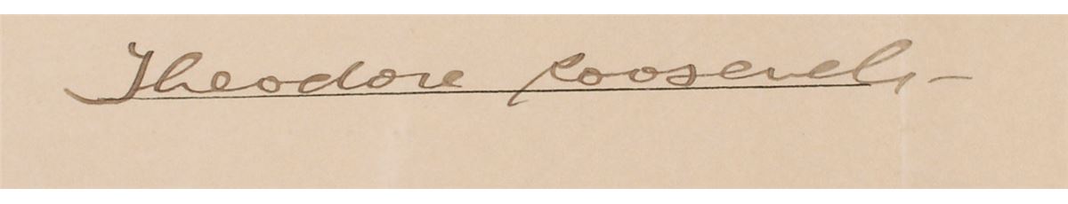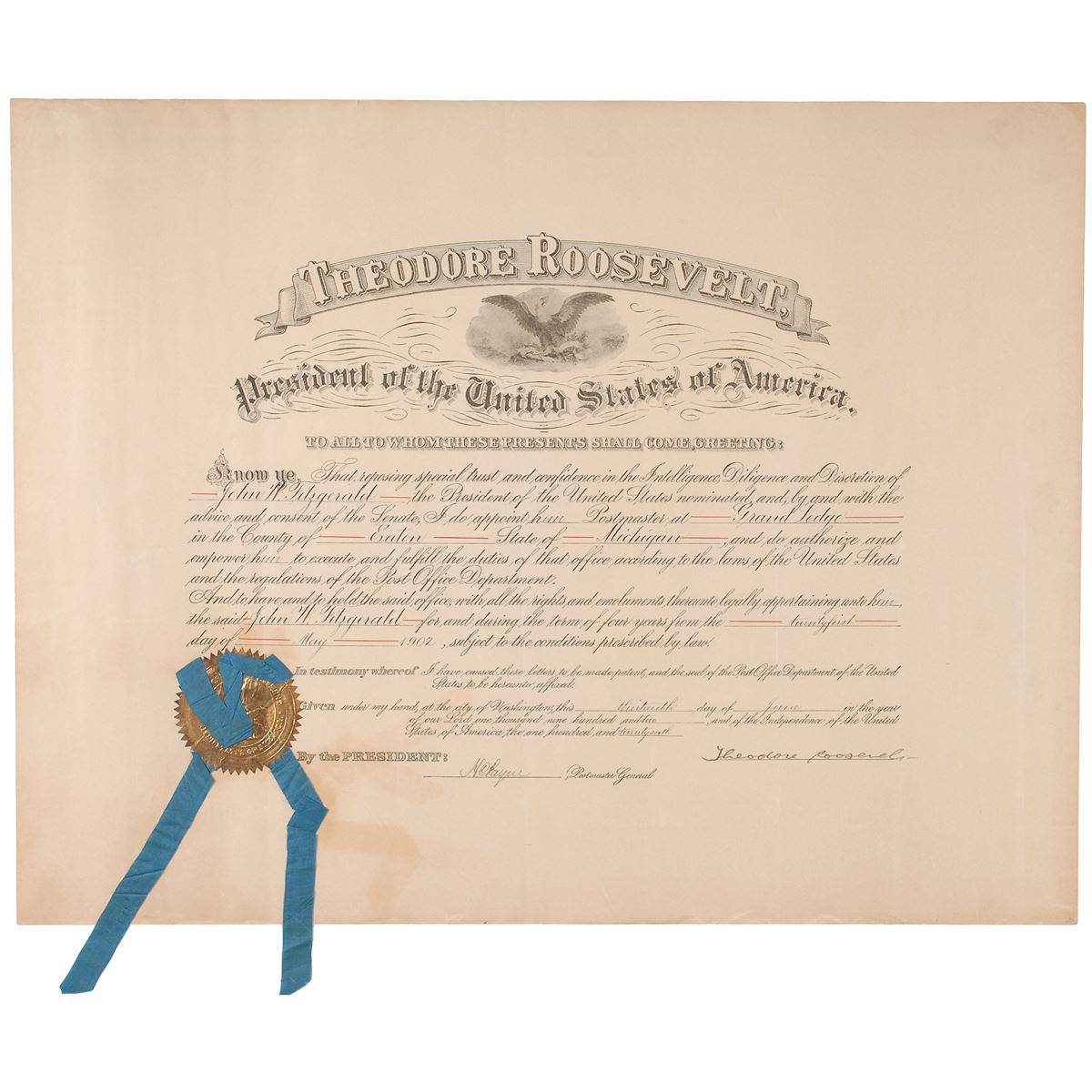 Partly-printed DS as president, one page, 22 x 17, June 13, 1902. President Roosevelt appoints John W. Fitzgerald as “Postmaster at Grand Ledge in the County of Eaton State of Michigan.” Signed at the conclusion by President Roosevelt and countersigned by Postmaster General Henry C. Payne. The gold seal and ribbon affixed to the lower left remain intact. Rolled and in very good condition, with light vertical folds (two passing through letters of the signature), toning to the lower left from the seal and ribbon, and edge dings and creases.