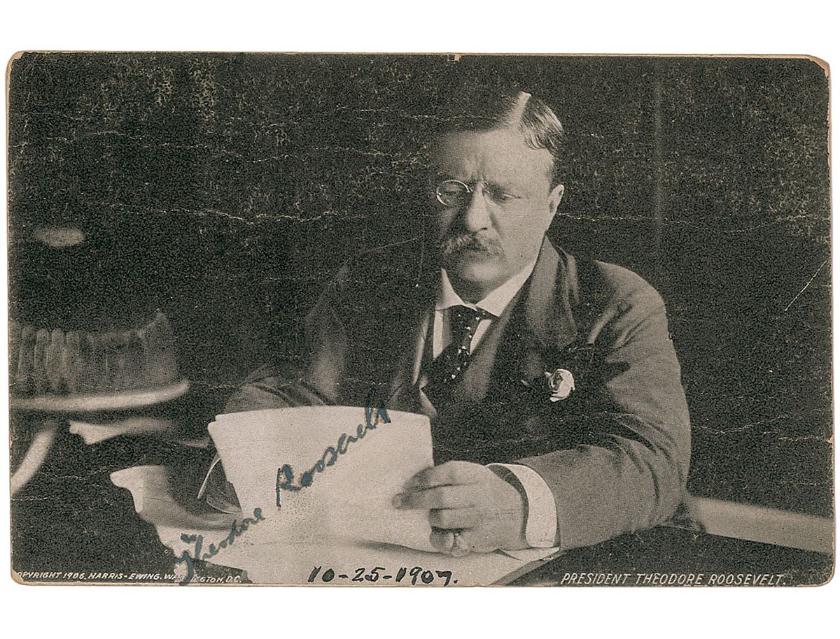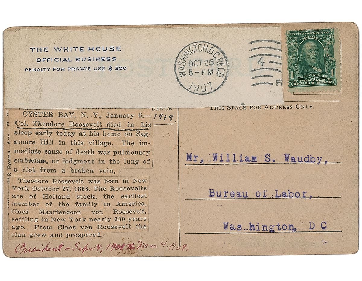 Desirable 5.5 x 3.5 postcard photo of President Roosevelt poring over papers at his desk, signed in black ink. A slip clipped from the original White House mailing envelope is affixed to the reverse and bears a 1907 postmark. In very good condition, with overall creases, light rubbing, and feathering to ink.