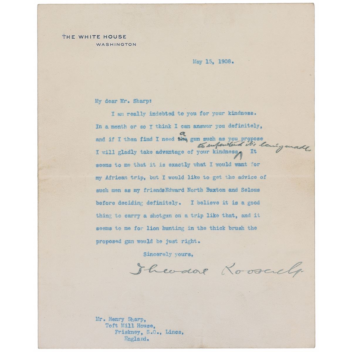 TLS as president, one page, 7 x 8.75, White House letterhead, May 15, 1908. Letter to Henry Sharp at the Toft Mill House in England. In part: “In a month or so I think I can answer you definitely, and if I then find I need a gun such as you propose I will gladly take advantage of your kindness to superintend its being made. It seems to me that it is exactly what I would want for my African trip, but I would like to get in the advice of such men as my friends Edward North Buxton and Selous before deciding definitely I believe it is a good thing to carry a shotgun on a trip like that, and it seems to me for lion hunting in the thick brush the proposed gun would be just right.” Roosevelt makes one correction to the text and adds a phrase in his own hand. In fine condition. Henry Sharp wrote several articles and books focusing on guns in relation to game hunting, and apparently offered to oversee the development of a special gun for the famed Smithsonian–Roosevelt African Expedition in 1909–10. One of the men the president mentions in this letter, Frederick Selous, accompanied him on the expedition and helped to organize logistics. This trip to Africa was a defining moment in Roosevelt’s post-presidential legacy, even resulting in his authorship of African Game Trails, a book on the subject.