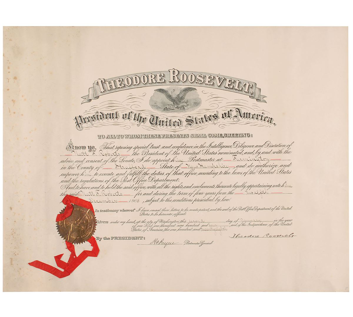 Partly-printed DS as president, one page, 22 x 17, January 2, 1904. President Roosevelt appoints Natt F. Roberts as “Postmaster at Farmington, in the County of Strafford, State of New Hampshire.” Boldly signed at the conclusion by President Roosevelt and countersigned by Postmaster General Henry C. Payne. The gold seal and red ribbon affixed to the lower left remain fully intact. Tightly rolled and in very good condition, with scattered bends and creases, and significant foxing and soiling to the left side.